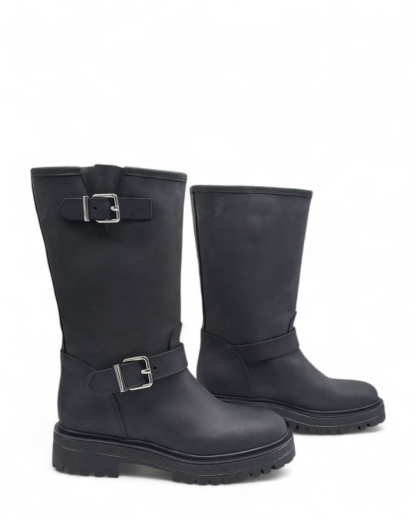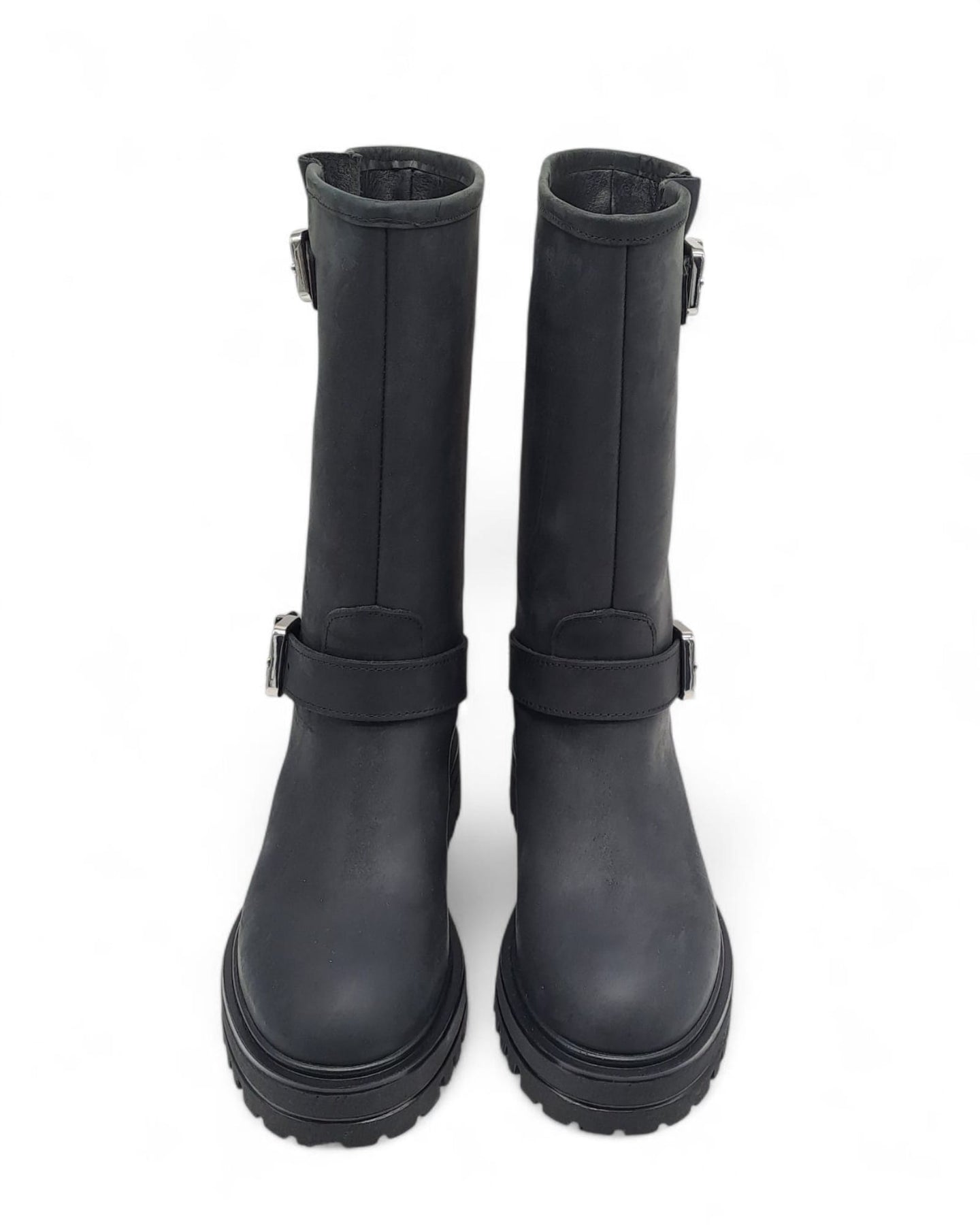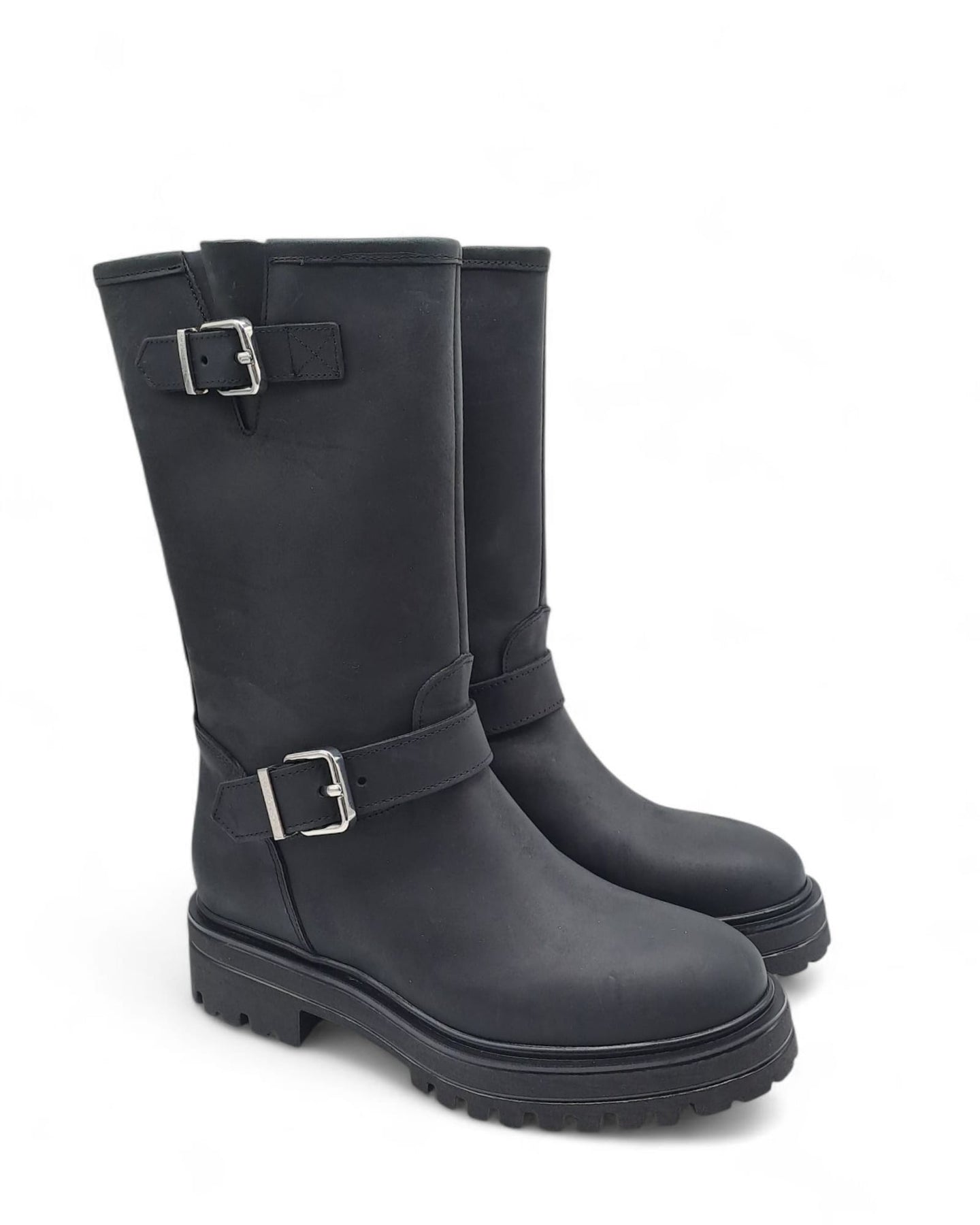 Stivali biker in pelle nero, modello tubolare senza cerniera con due fibbie laterali argento. Contattaci