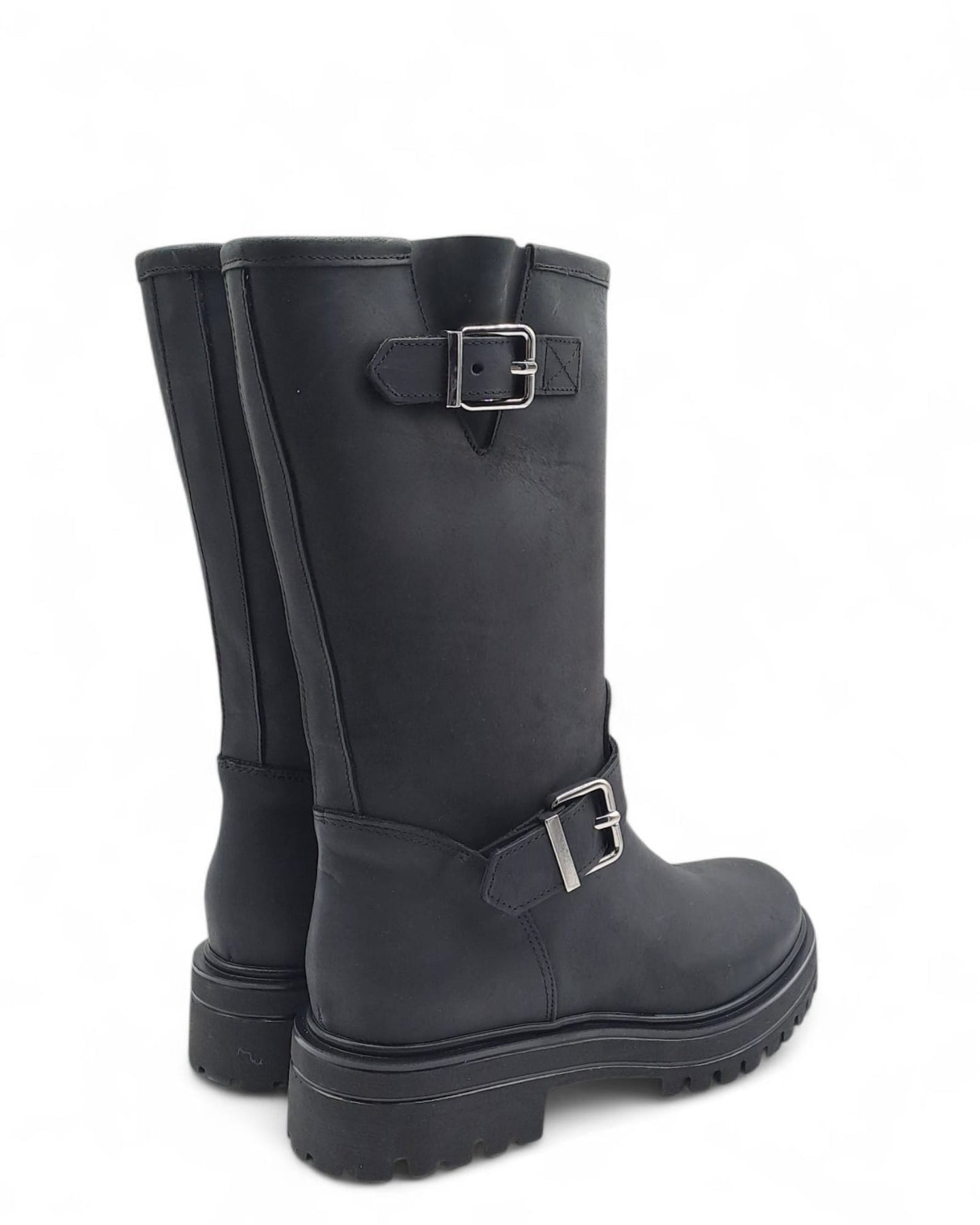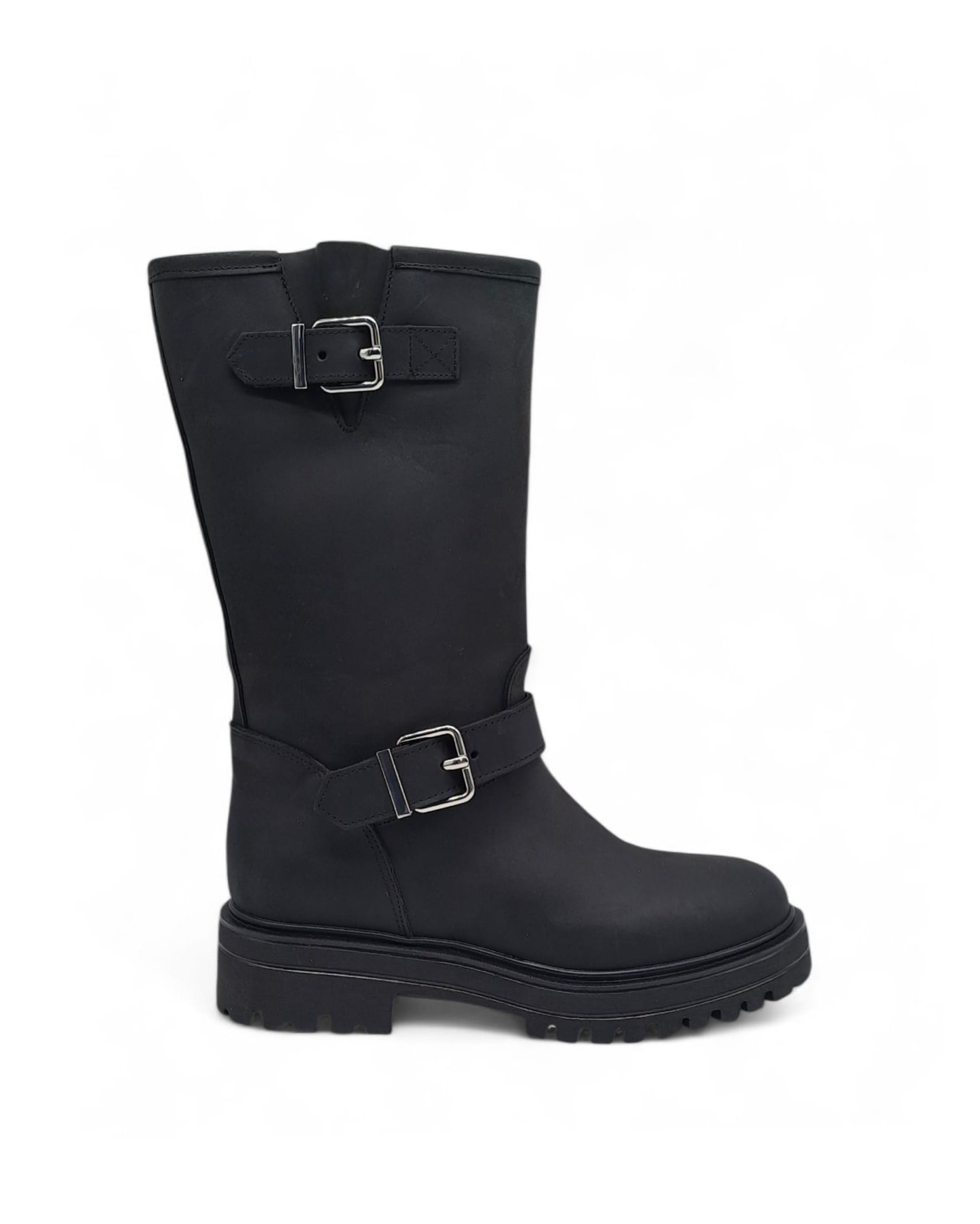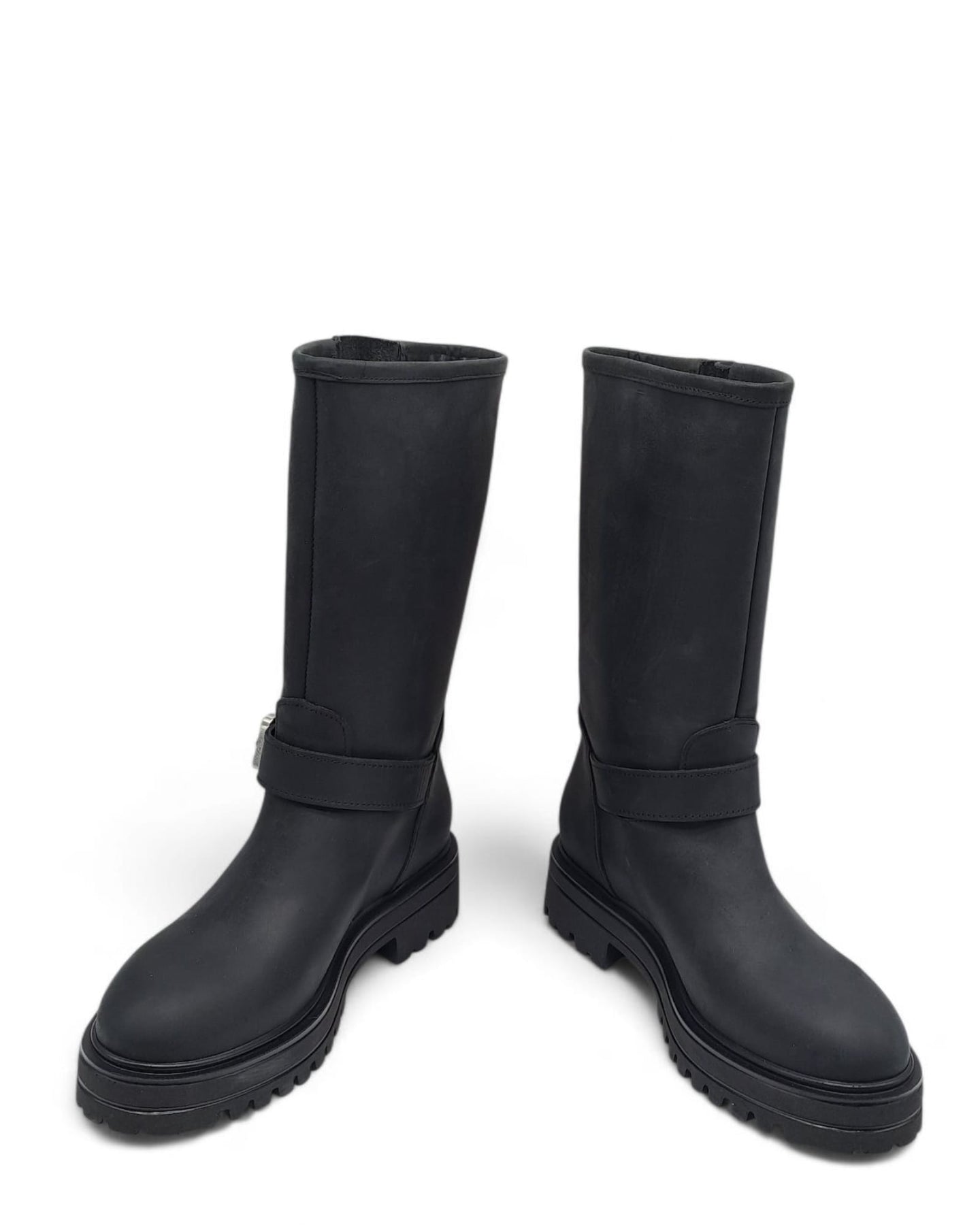 Stivali biker in pelle nero, modello tubolare senza cerniera con due fibbie laterali argento. Contattaci