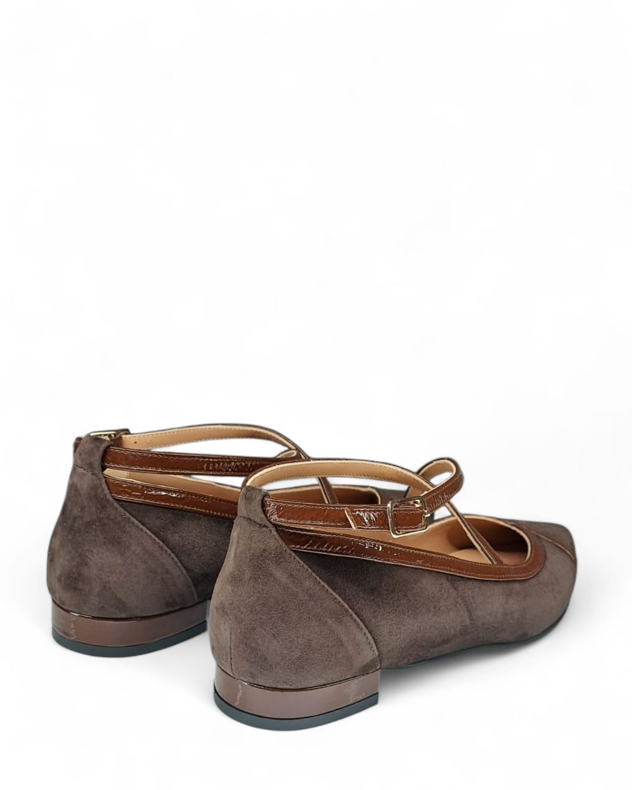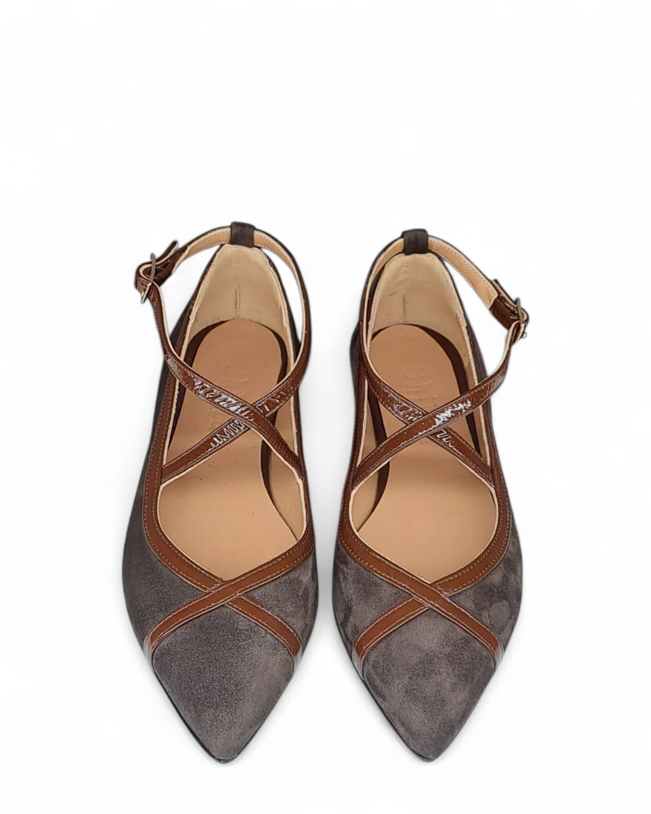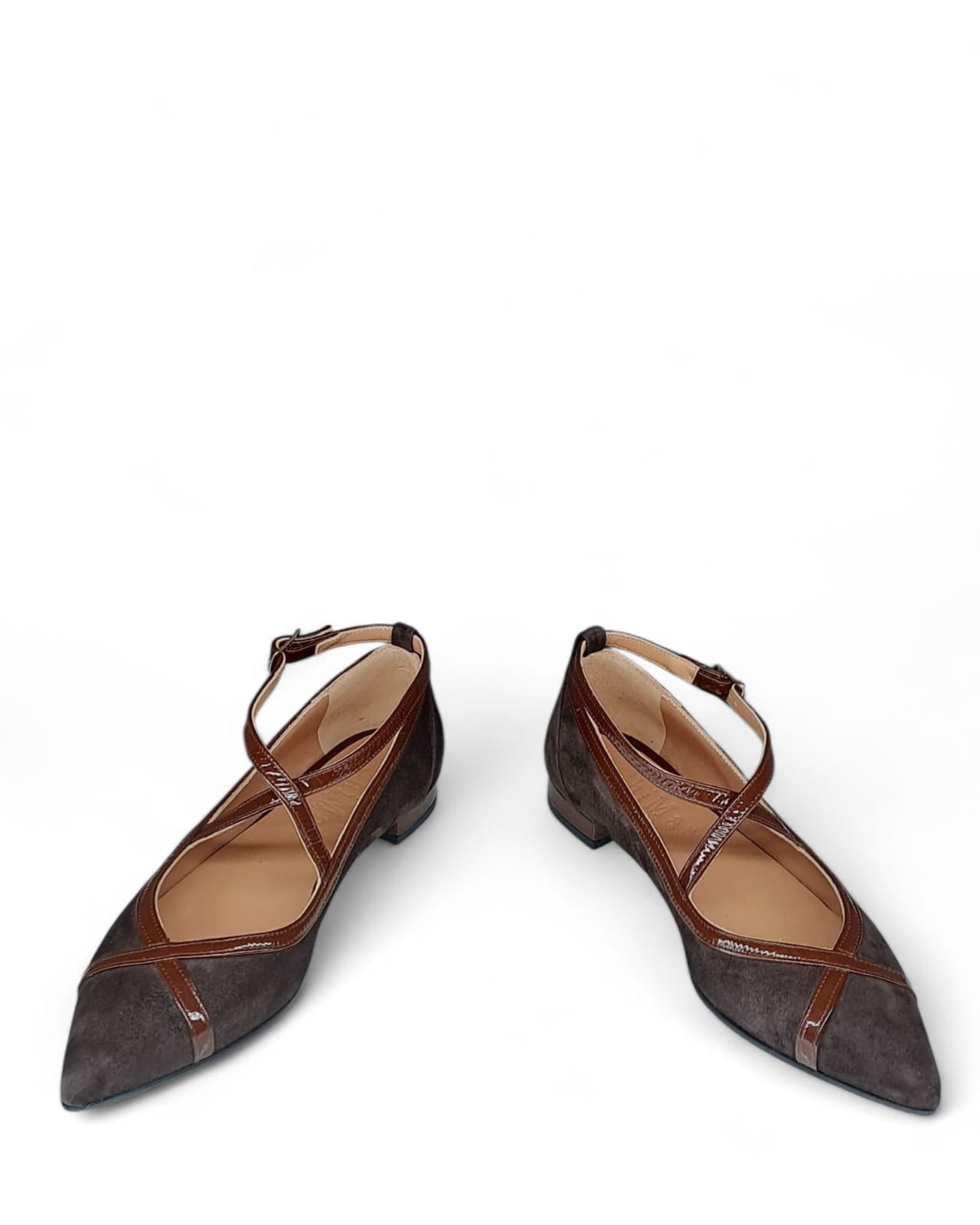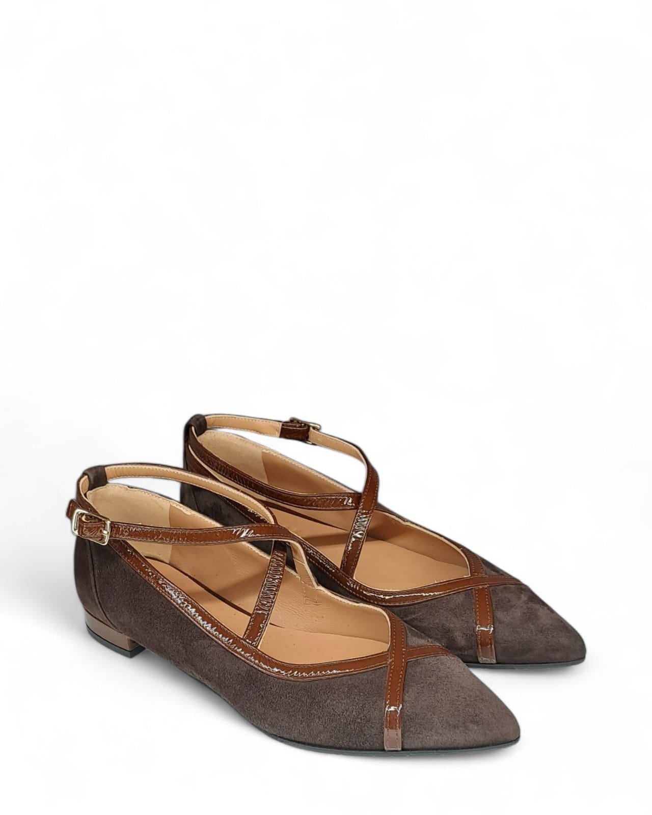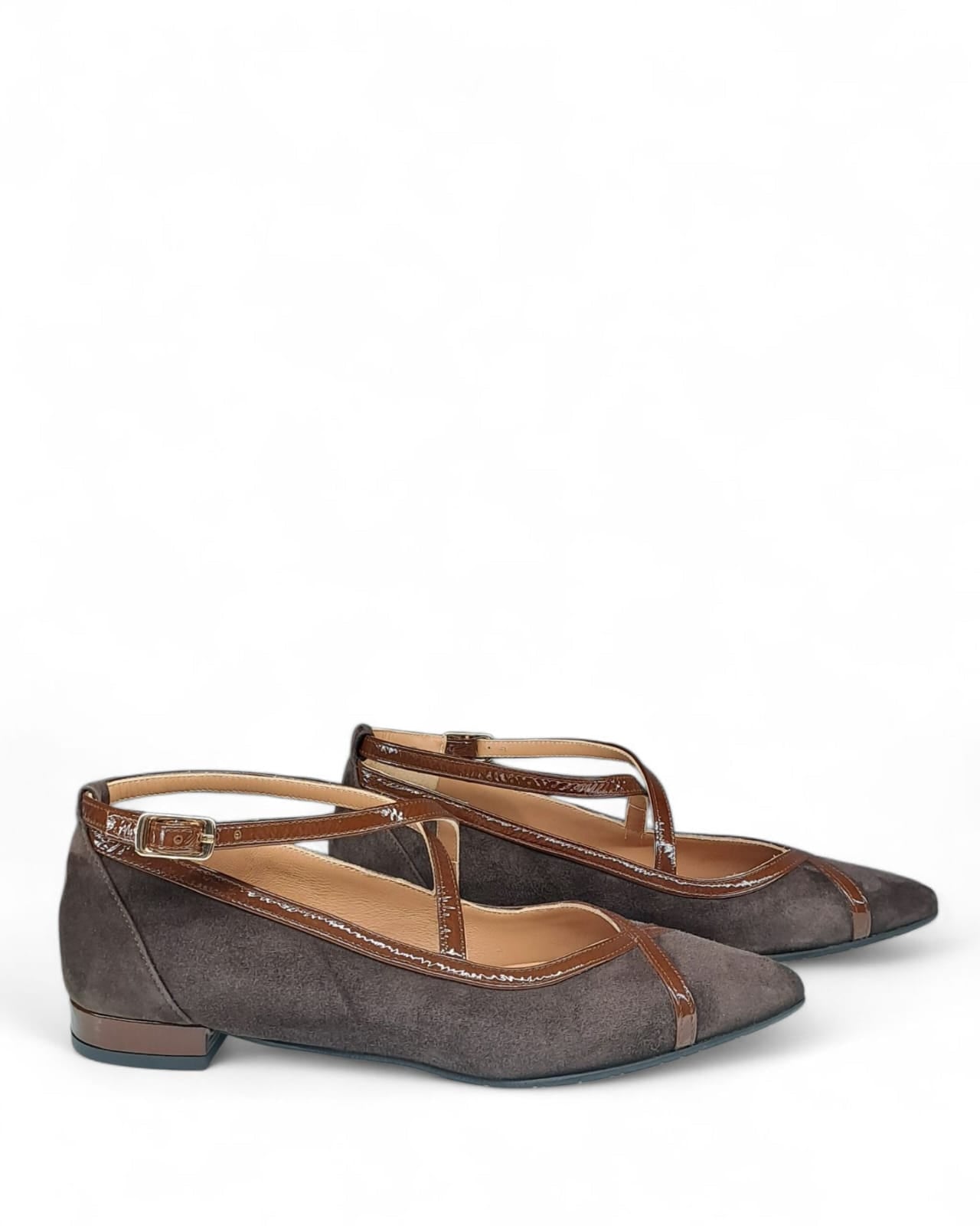 Ballerina a punta realizzata in camoscio testa di moro con cinturino e profilo e tacco in verlux sigaro.