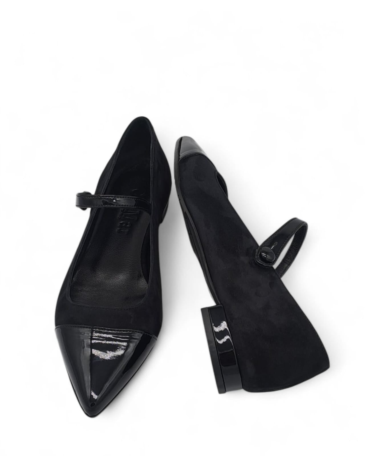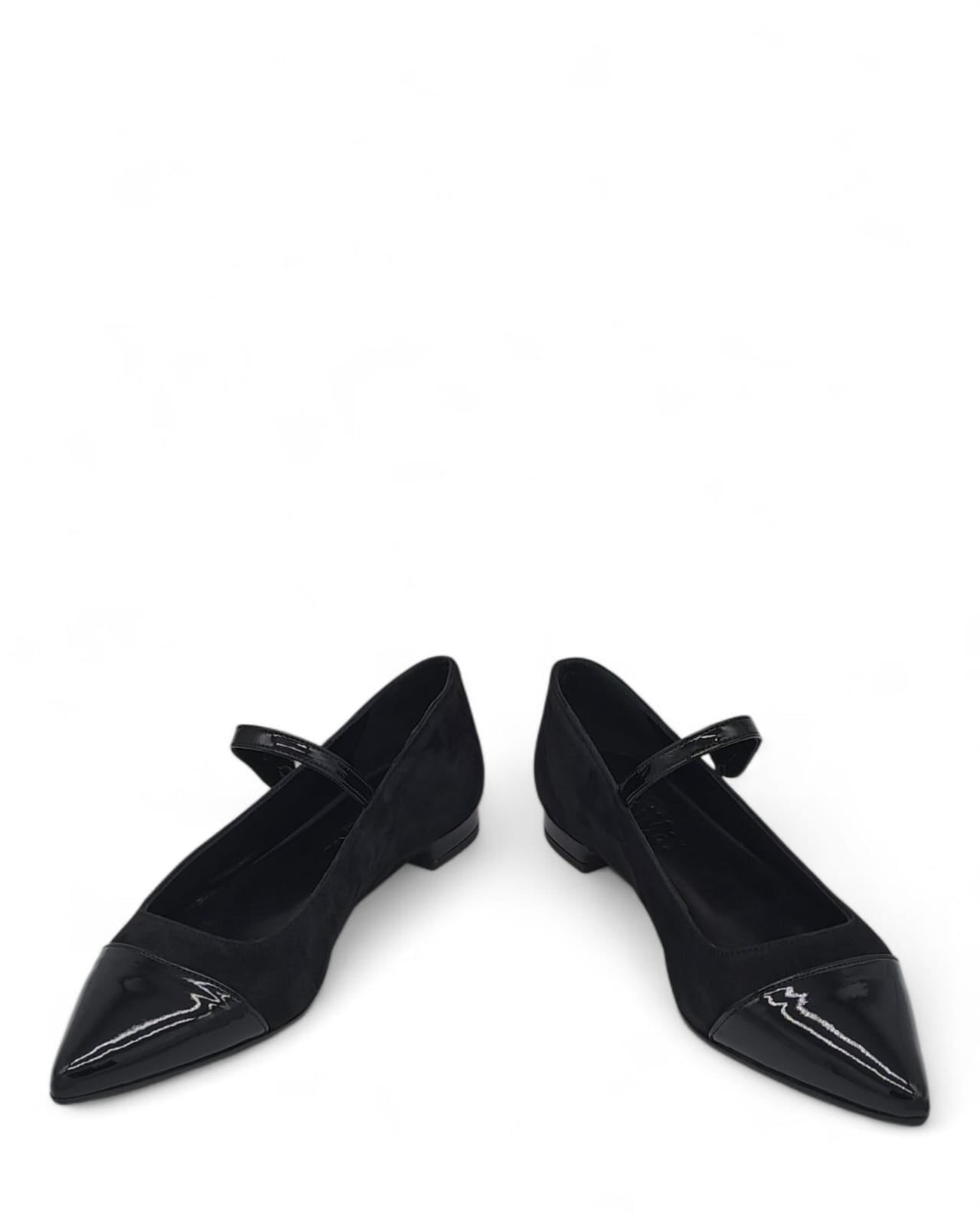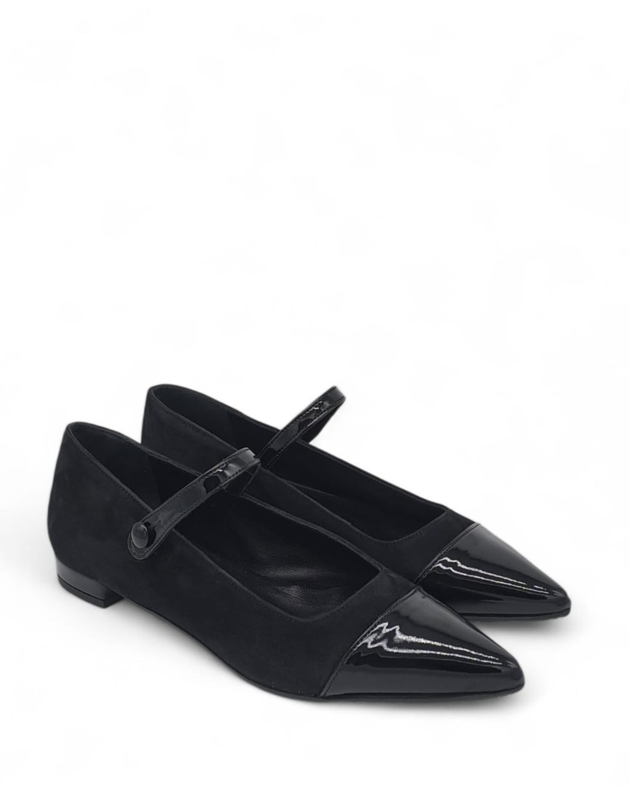 Ballerina a punta  realizzata in camoscio nero con cinturino puntina e tacco vernice nero.