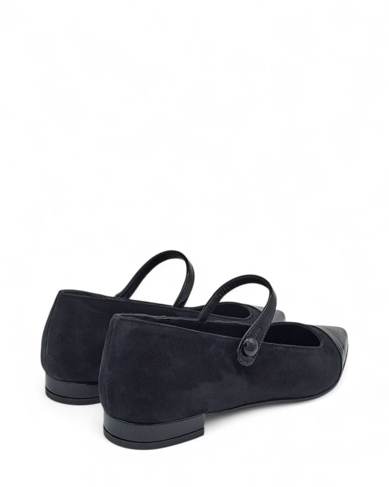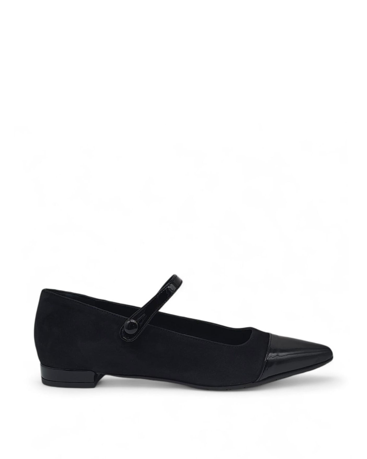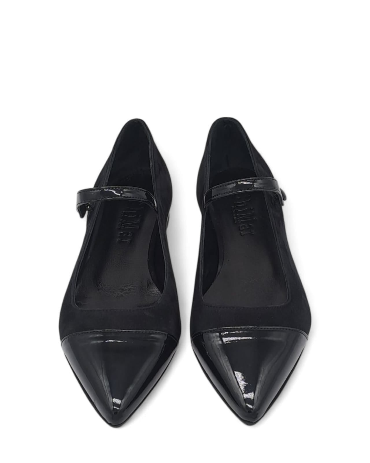 Ballerina a punta  realizzata in camoscio nero con cinturino puntina e tacco vernice nero.