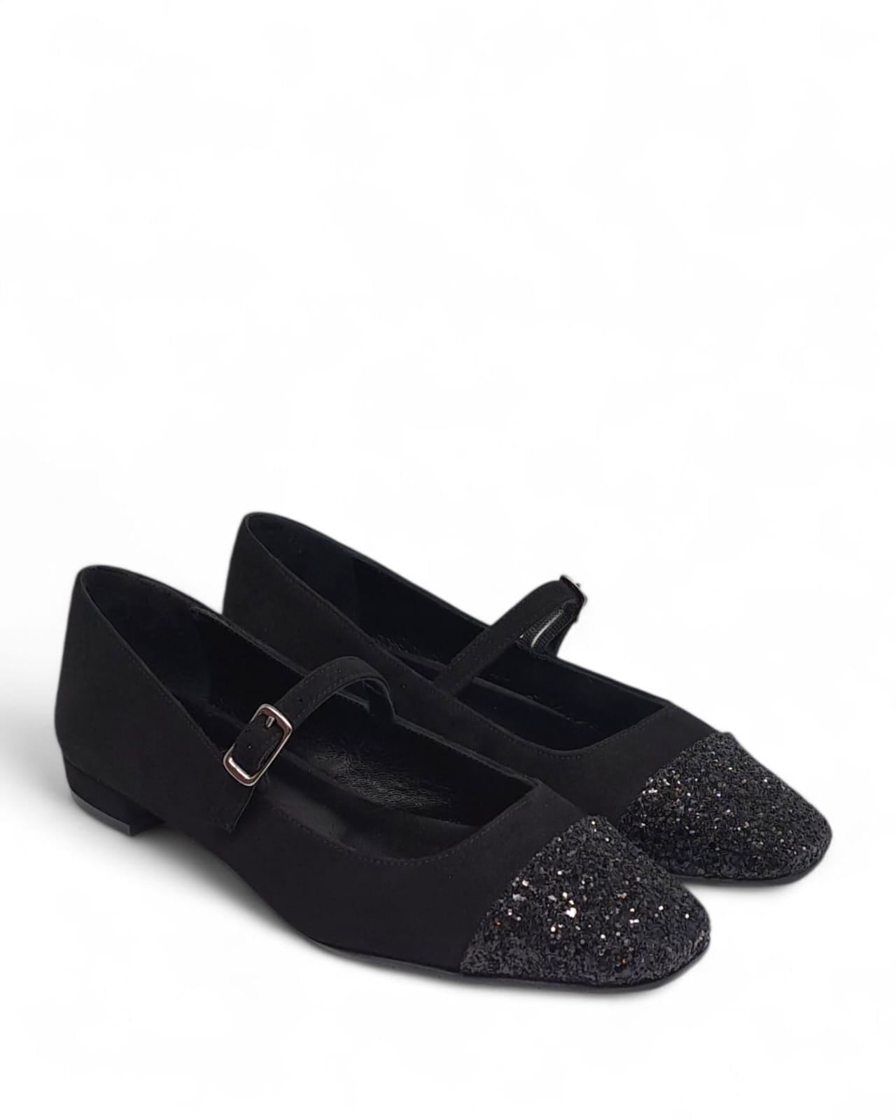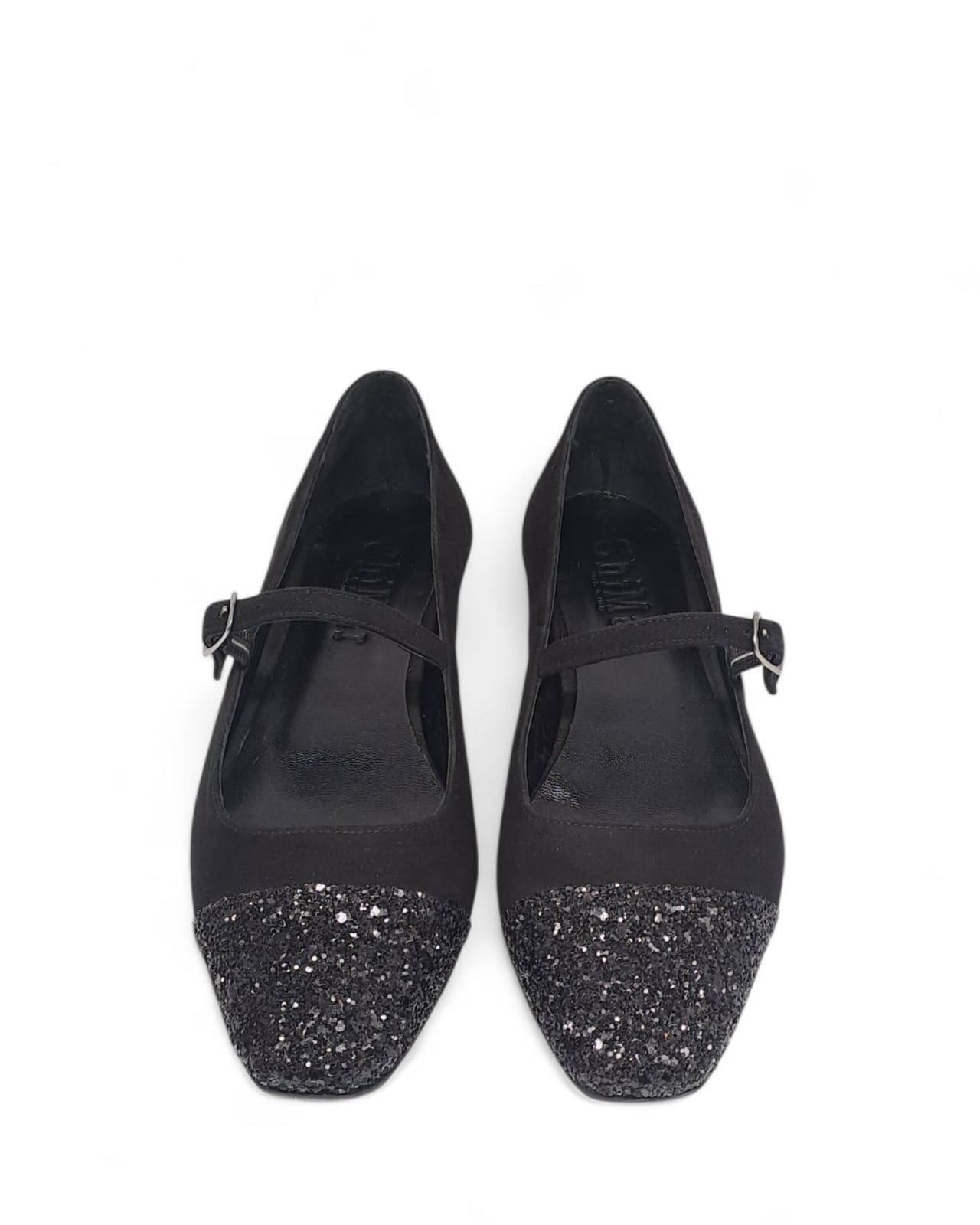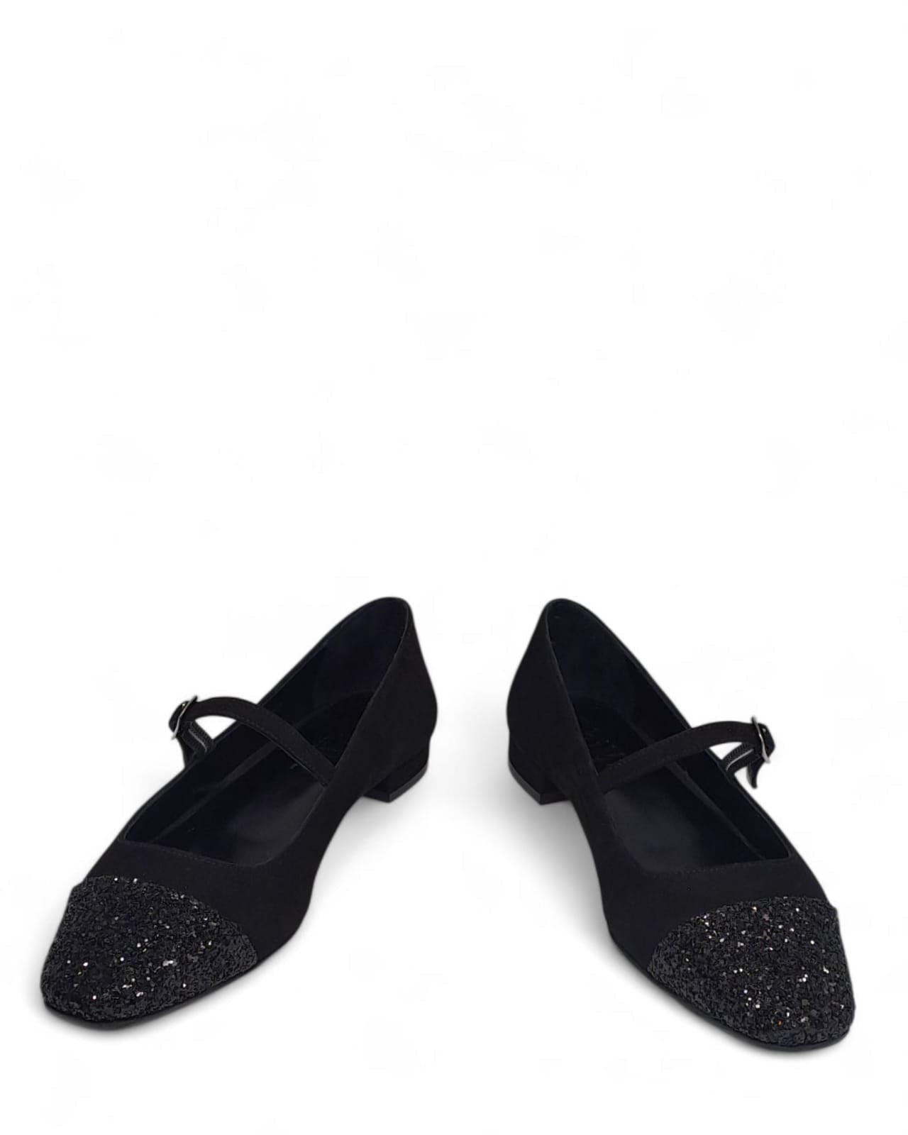 Ballerina a punta realizzata in camoscio nero con puntina in glitter nero. Contattaci