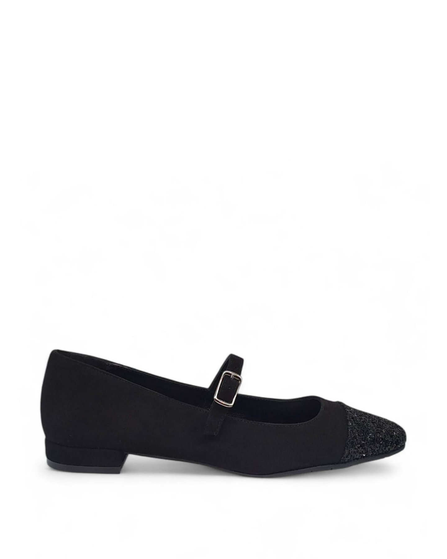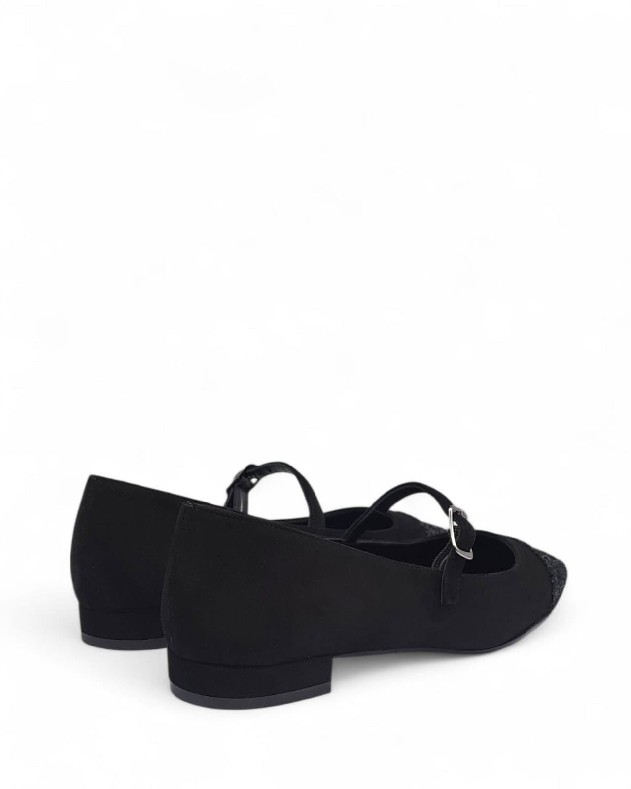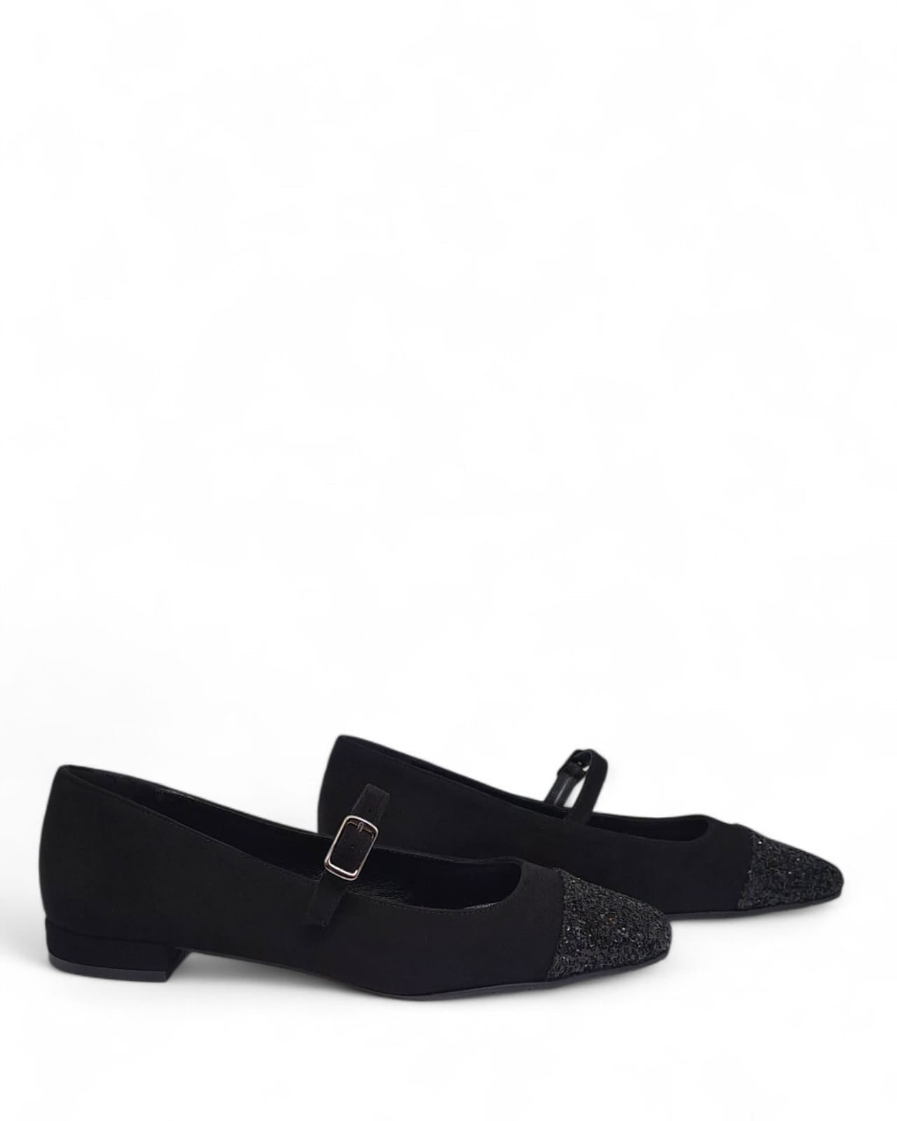 Ballerina a punta realizzata in camoscio nero con puntina in glitter nero. Contattaci