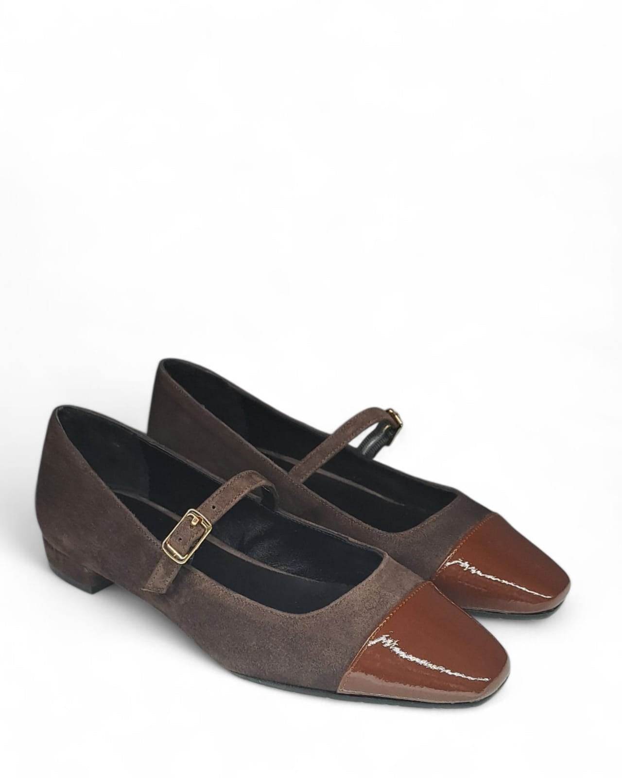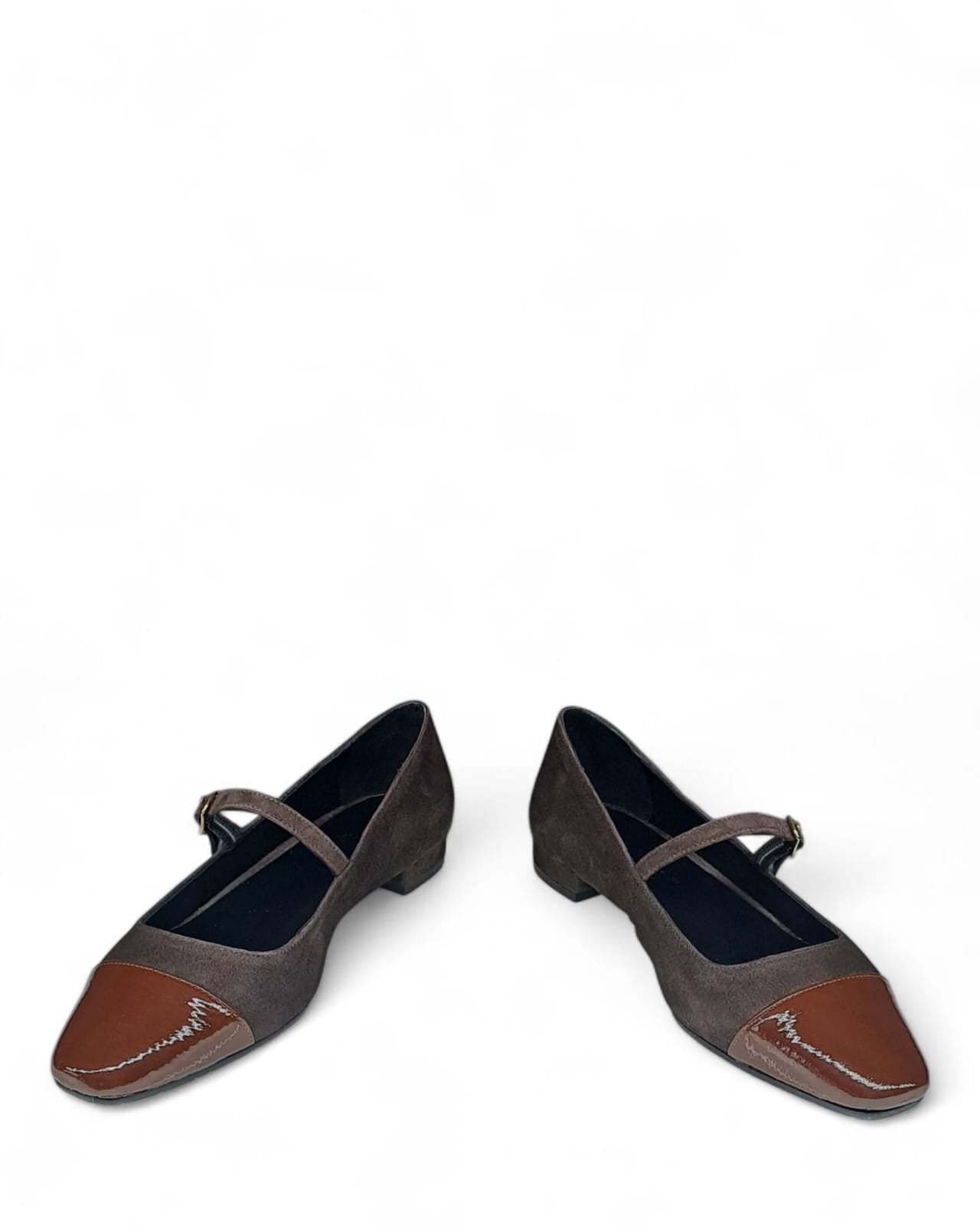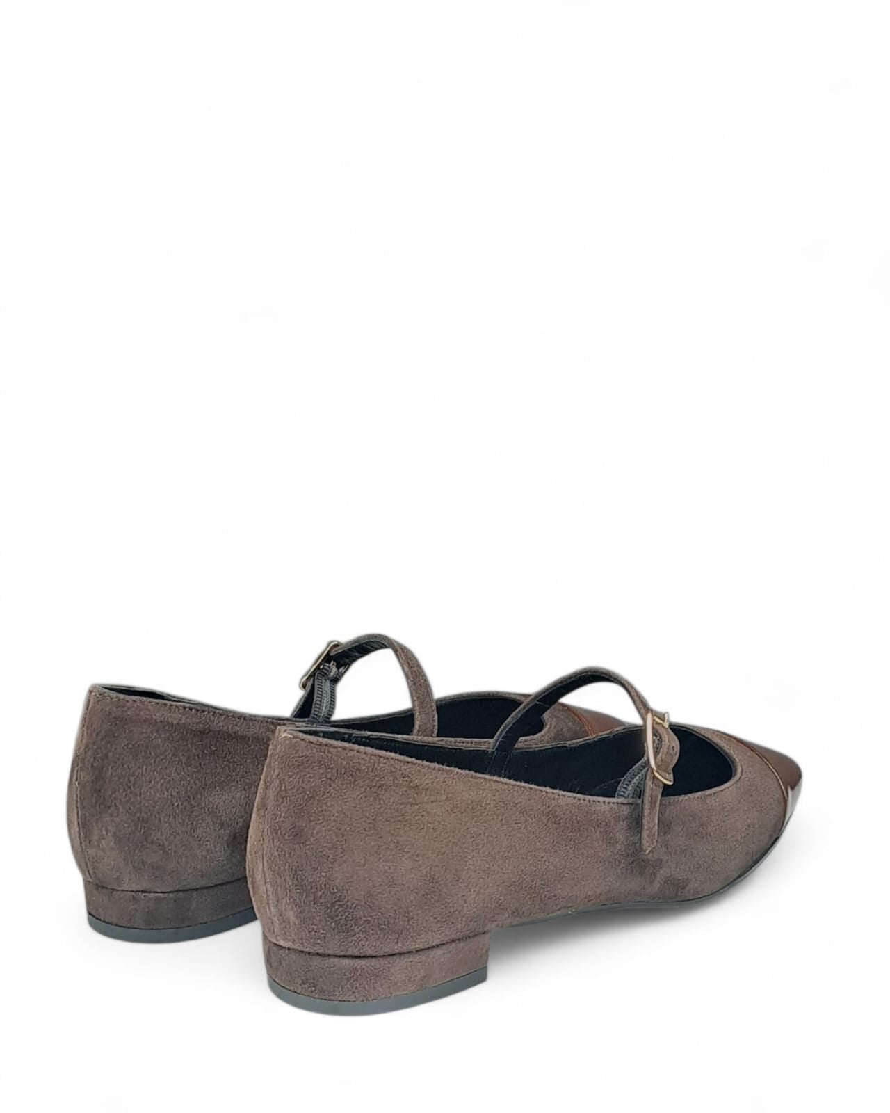 Ballerina a punta  realizzata in camoscio testa di moro  con puntina in finish sigaro.