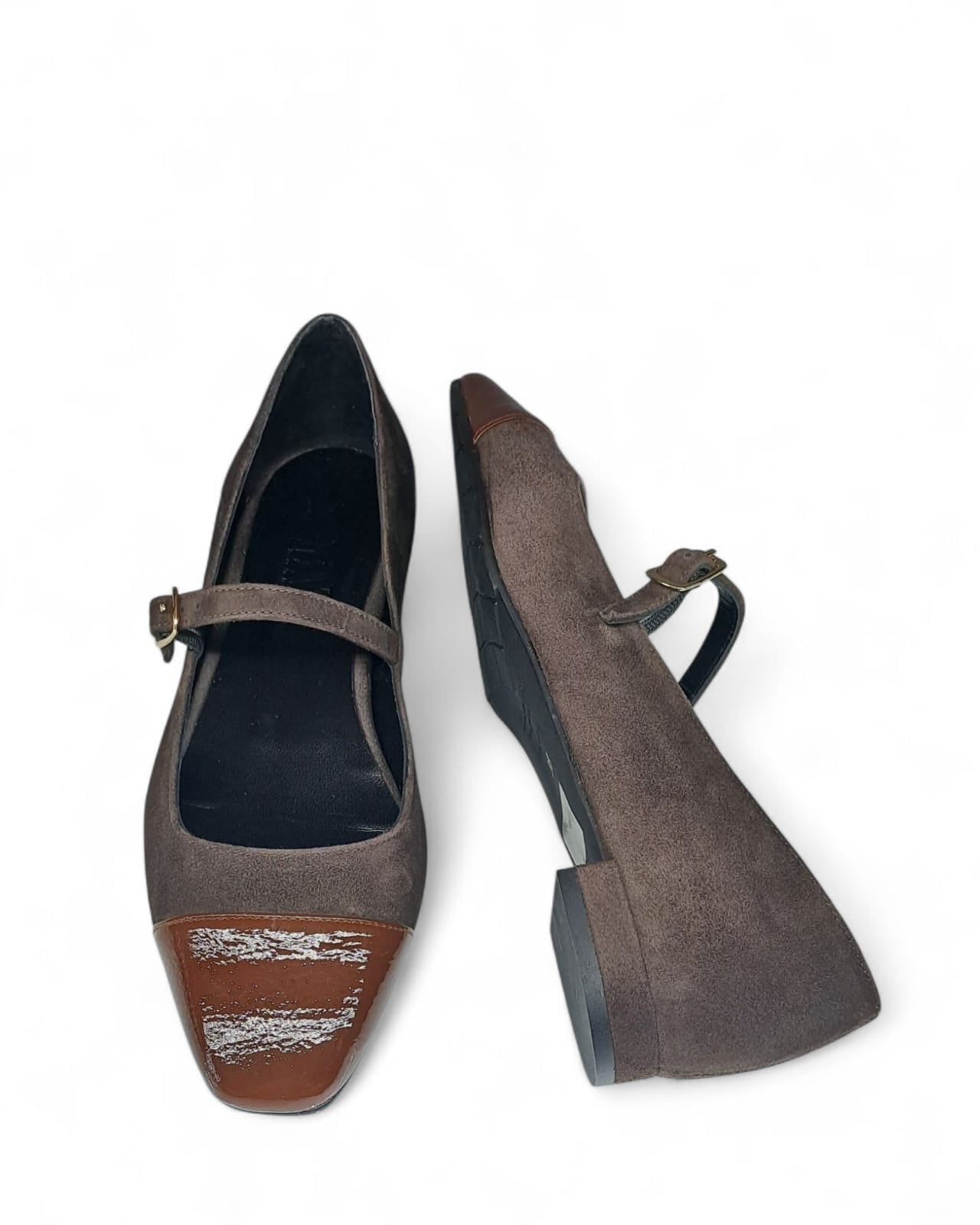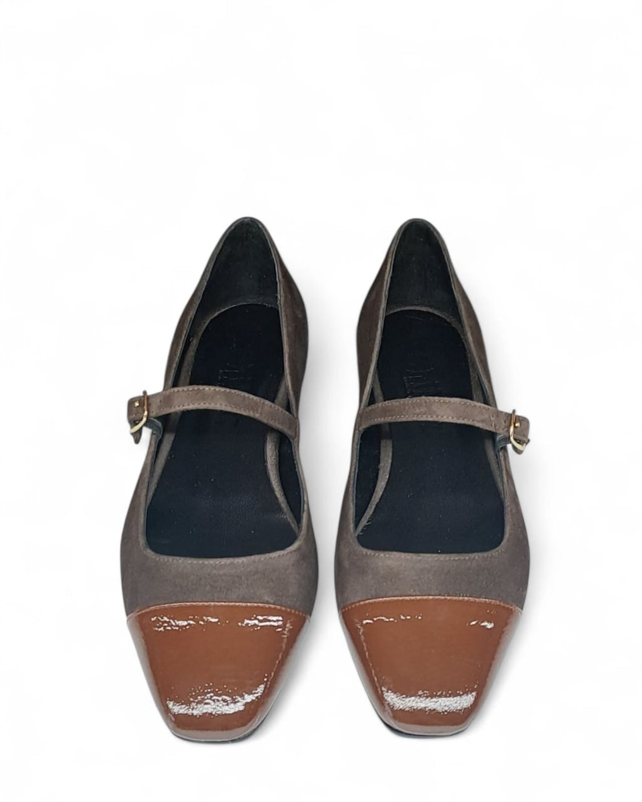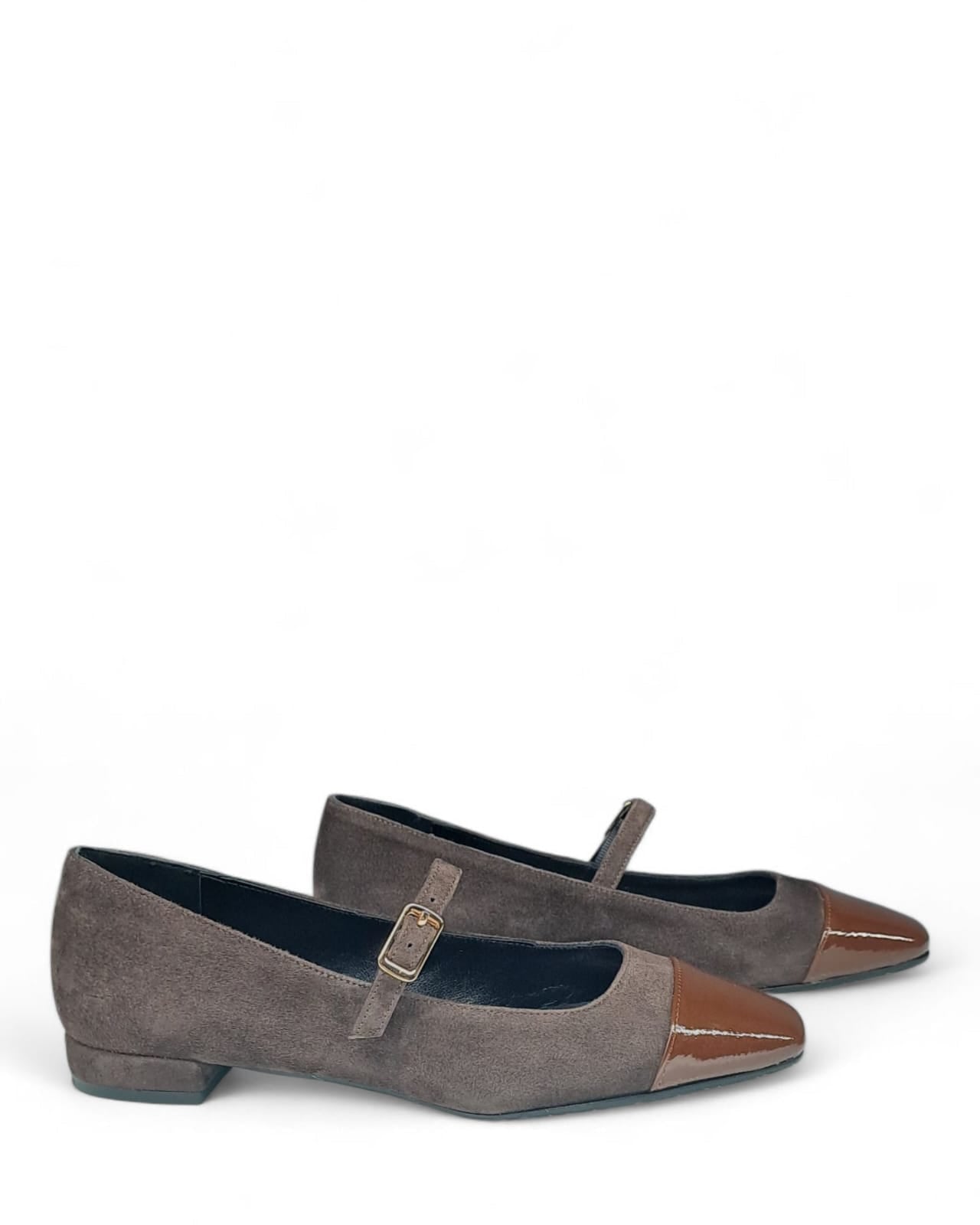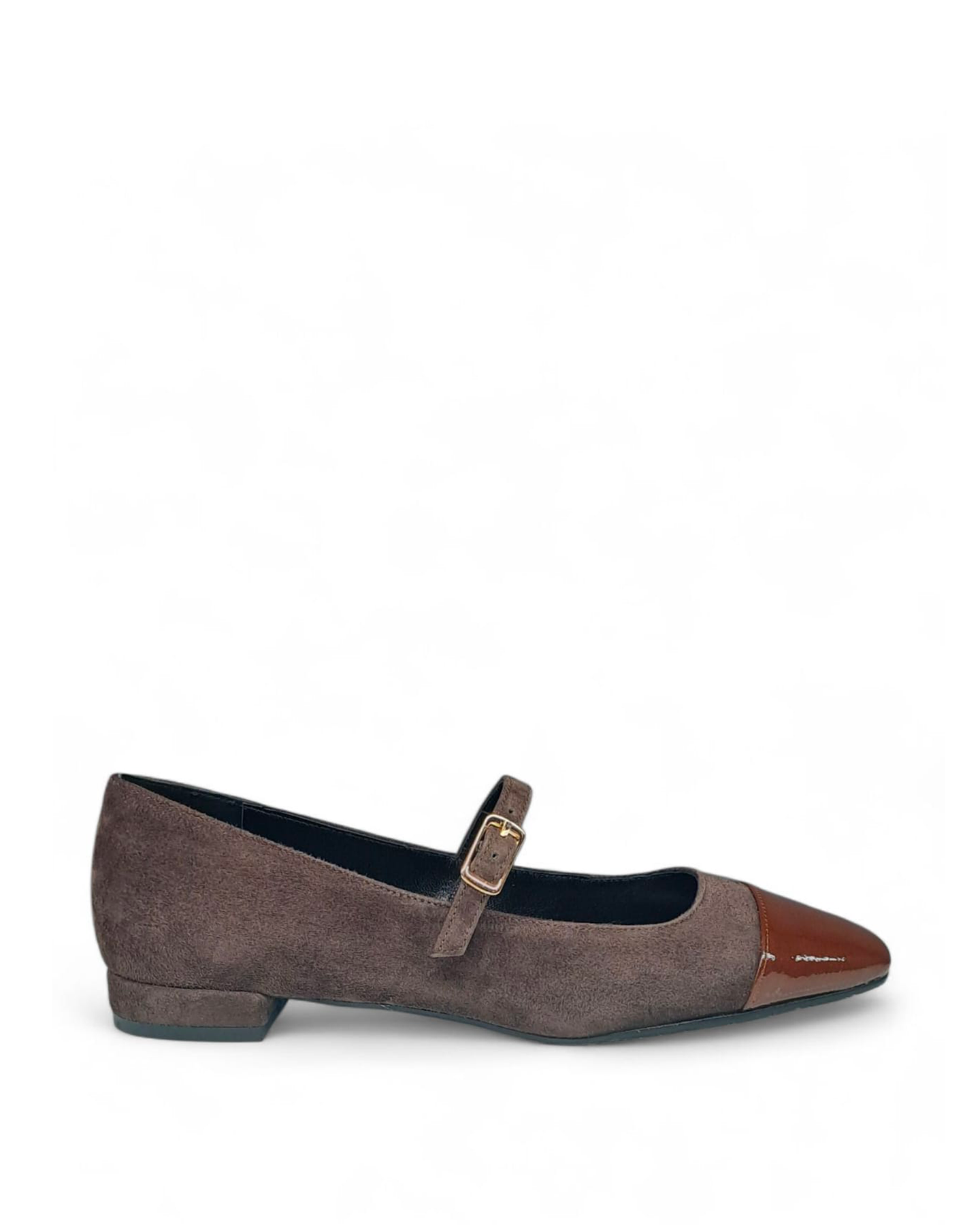 Ballerina a punta  realizzata in camoscio testa di moro  con puntina in finish sigaro.
