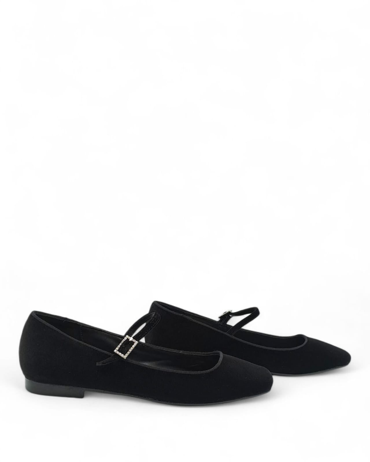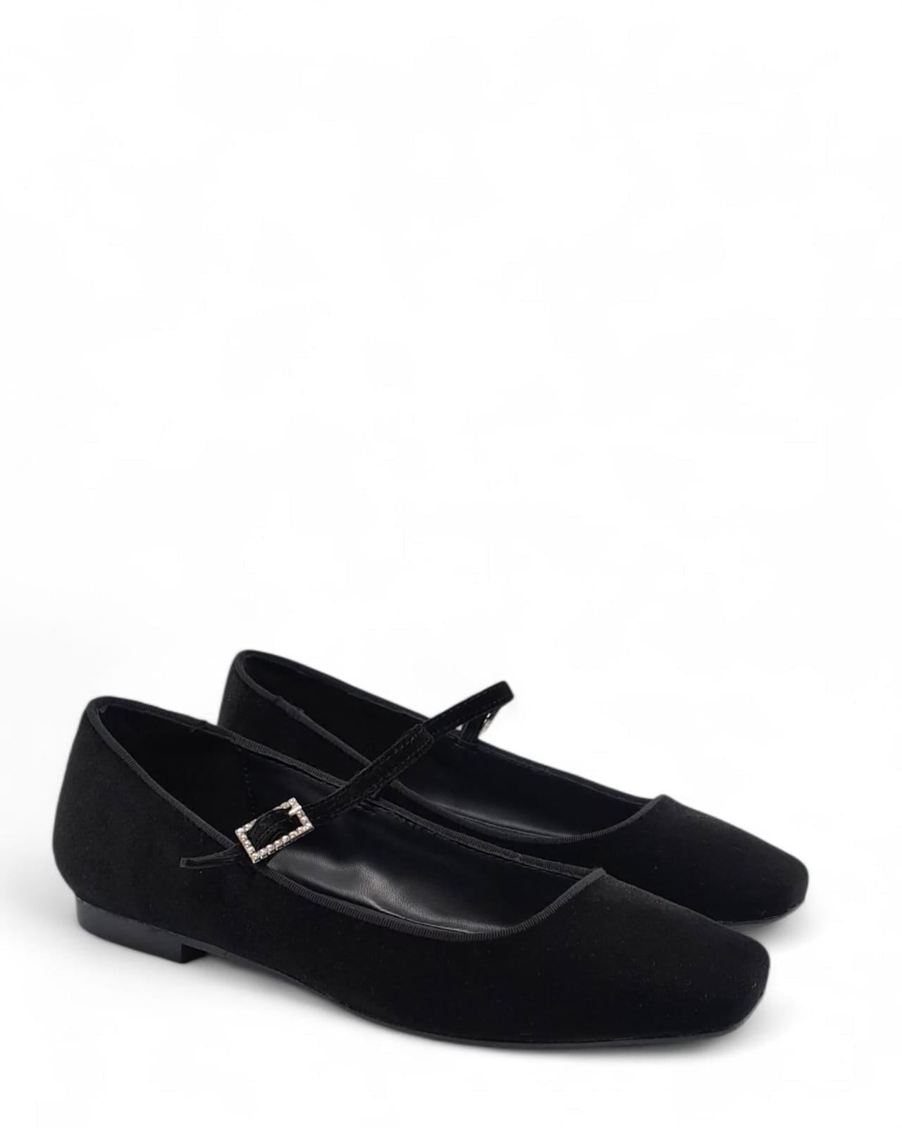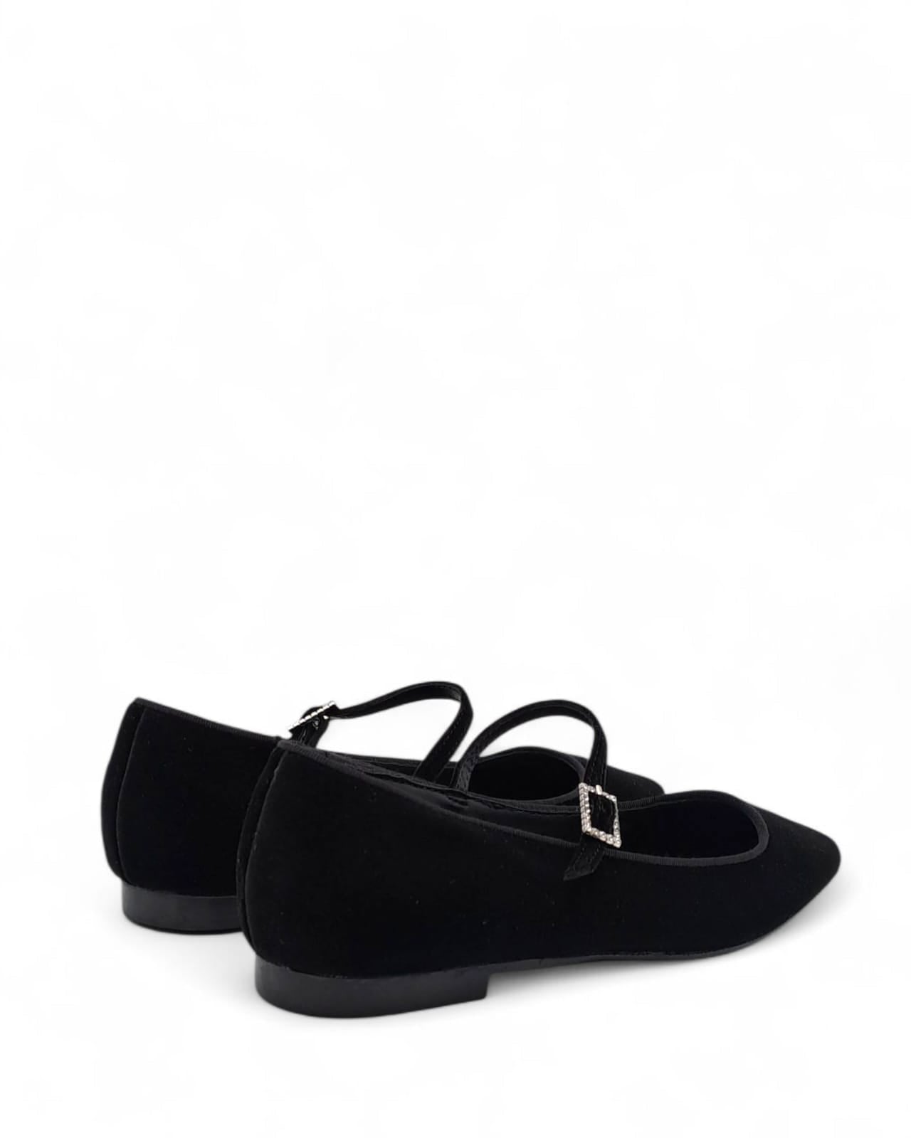 Ballerina punta quadra con cinturino in velluto nero , profilo in grogrè in tinta. Contattaci