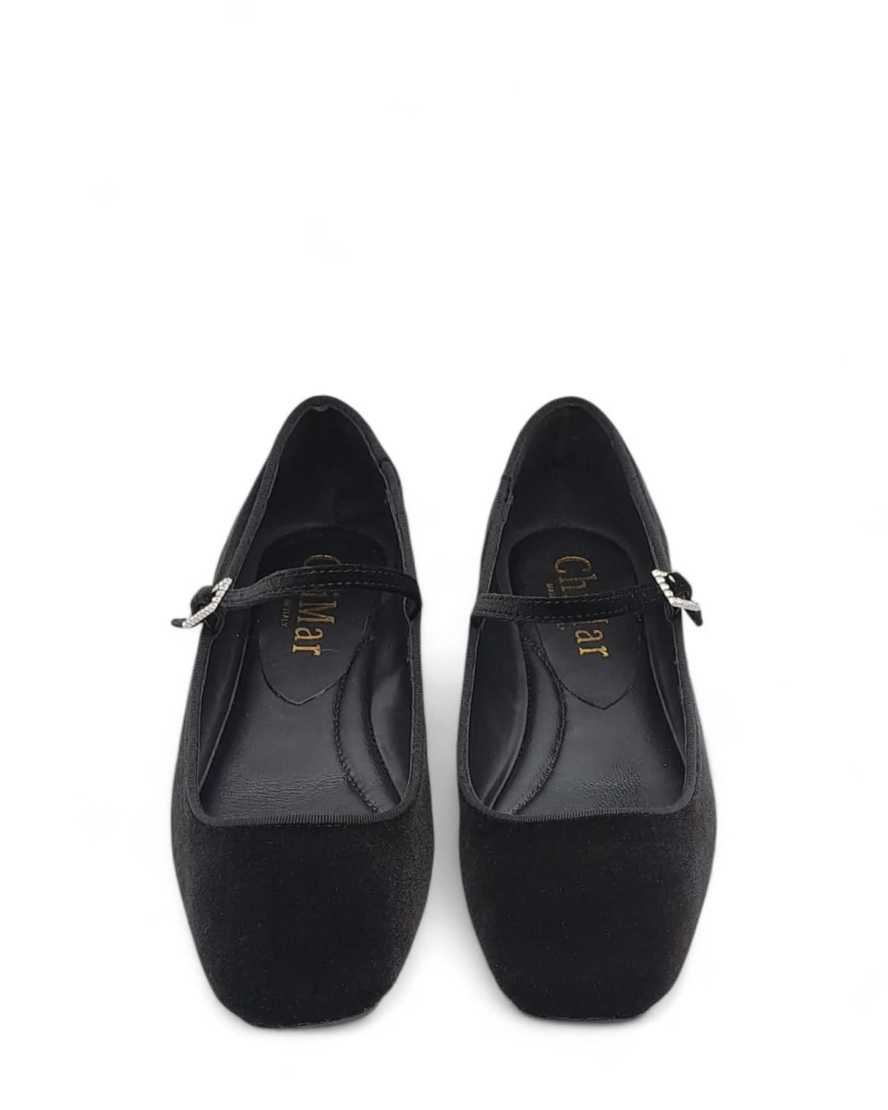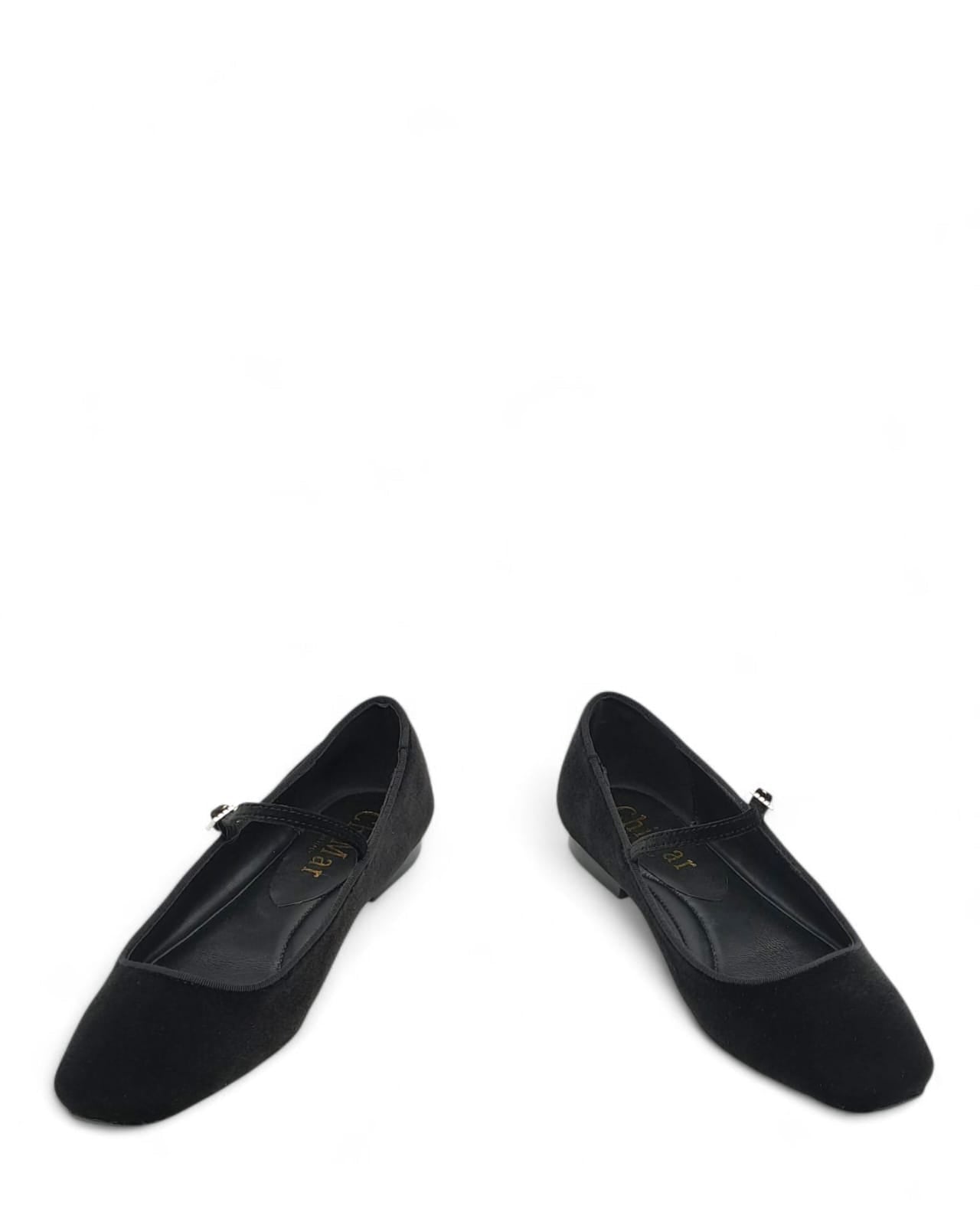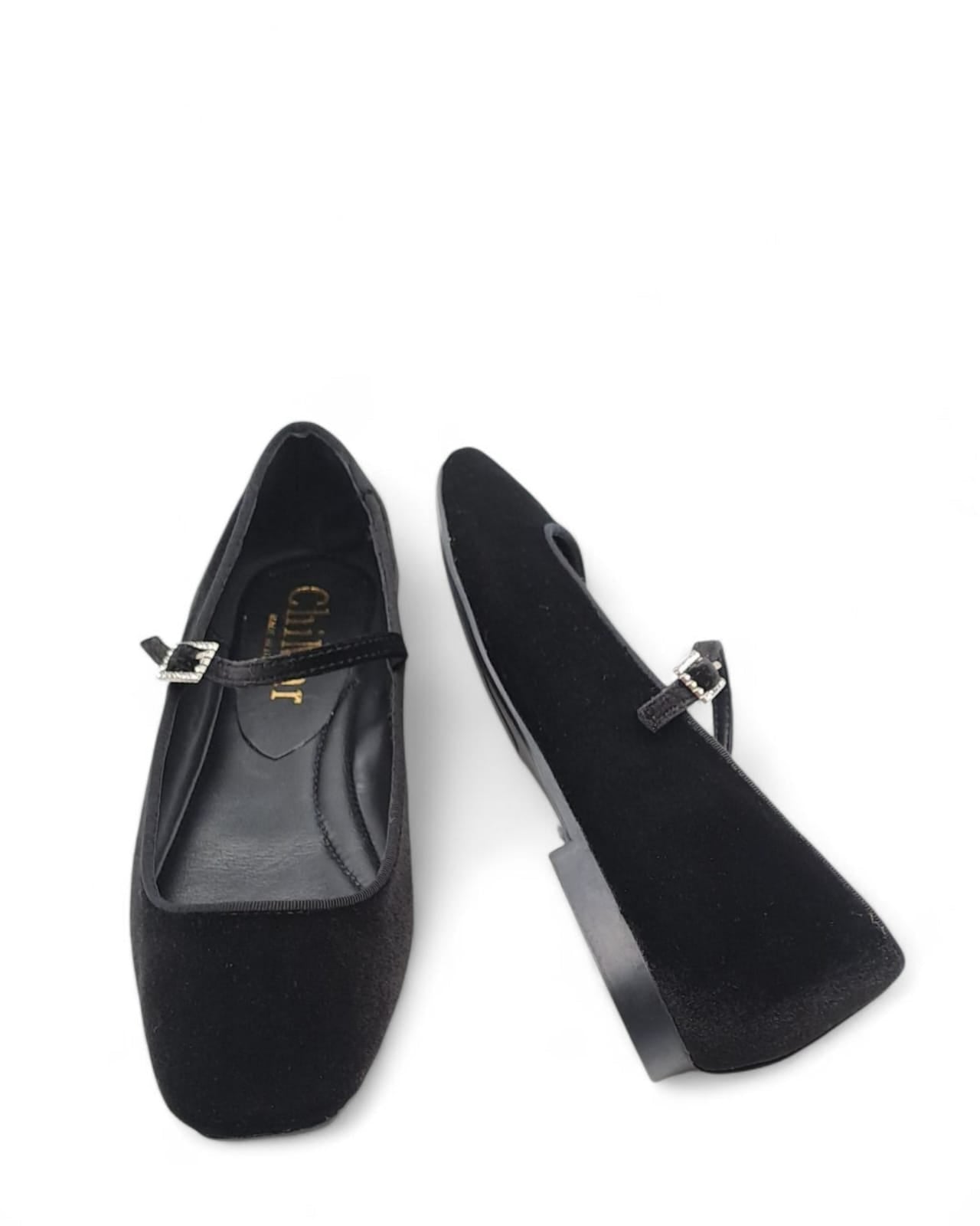 Ballerina punta quadra con cinturino in velluto nero , profilo in grogrè in tinta. Contattaci