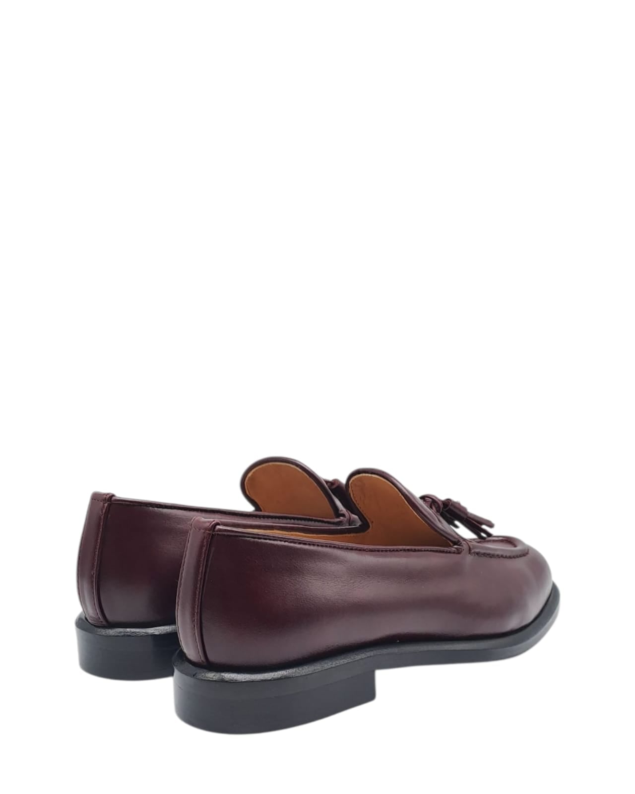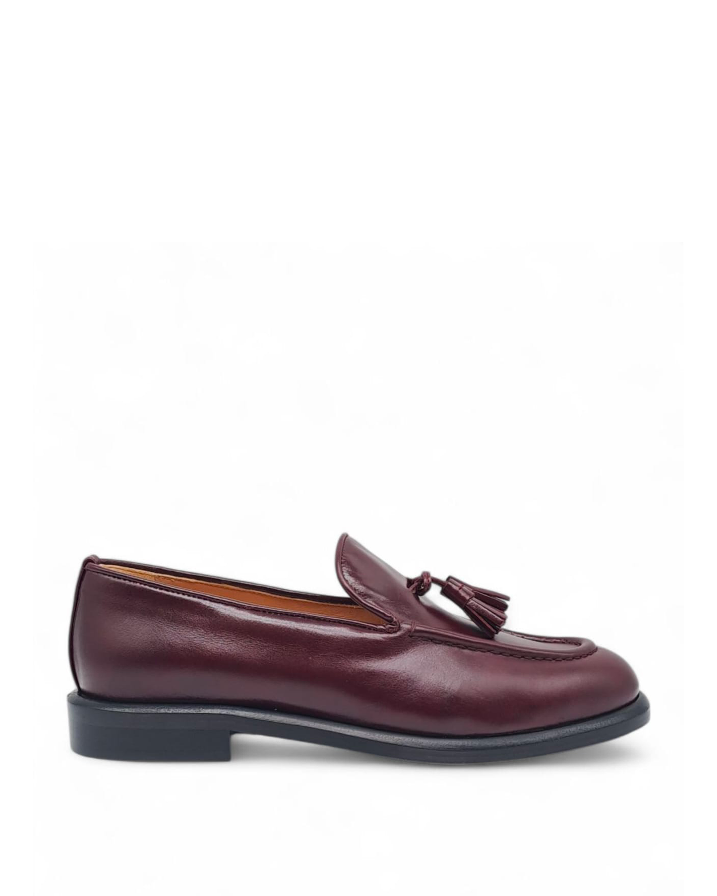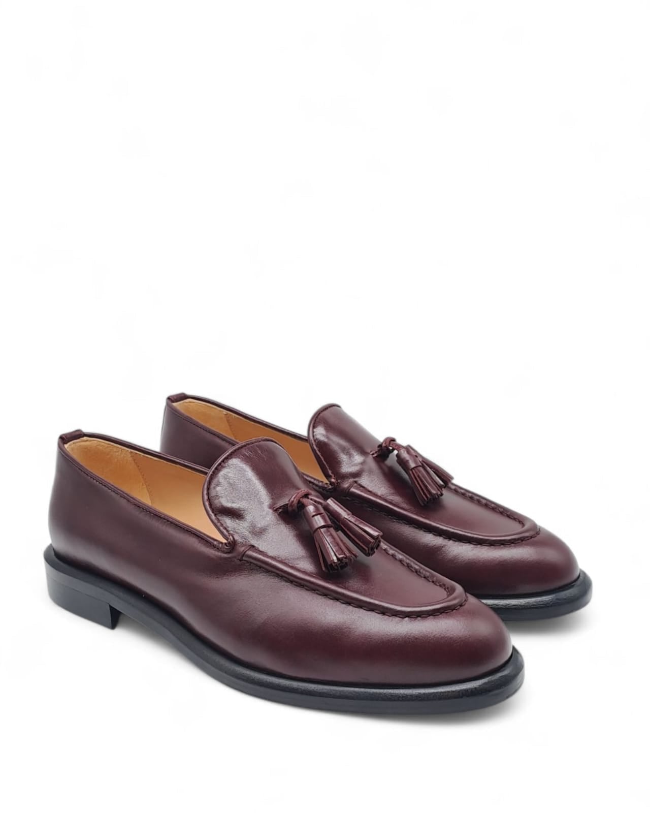 Mocassino con  nappine realizzato  in pelle  vino , lavorazione "a sacchetto":