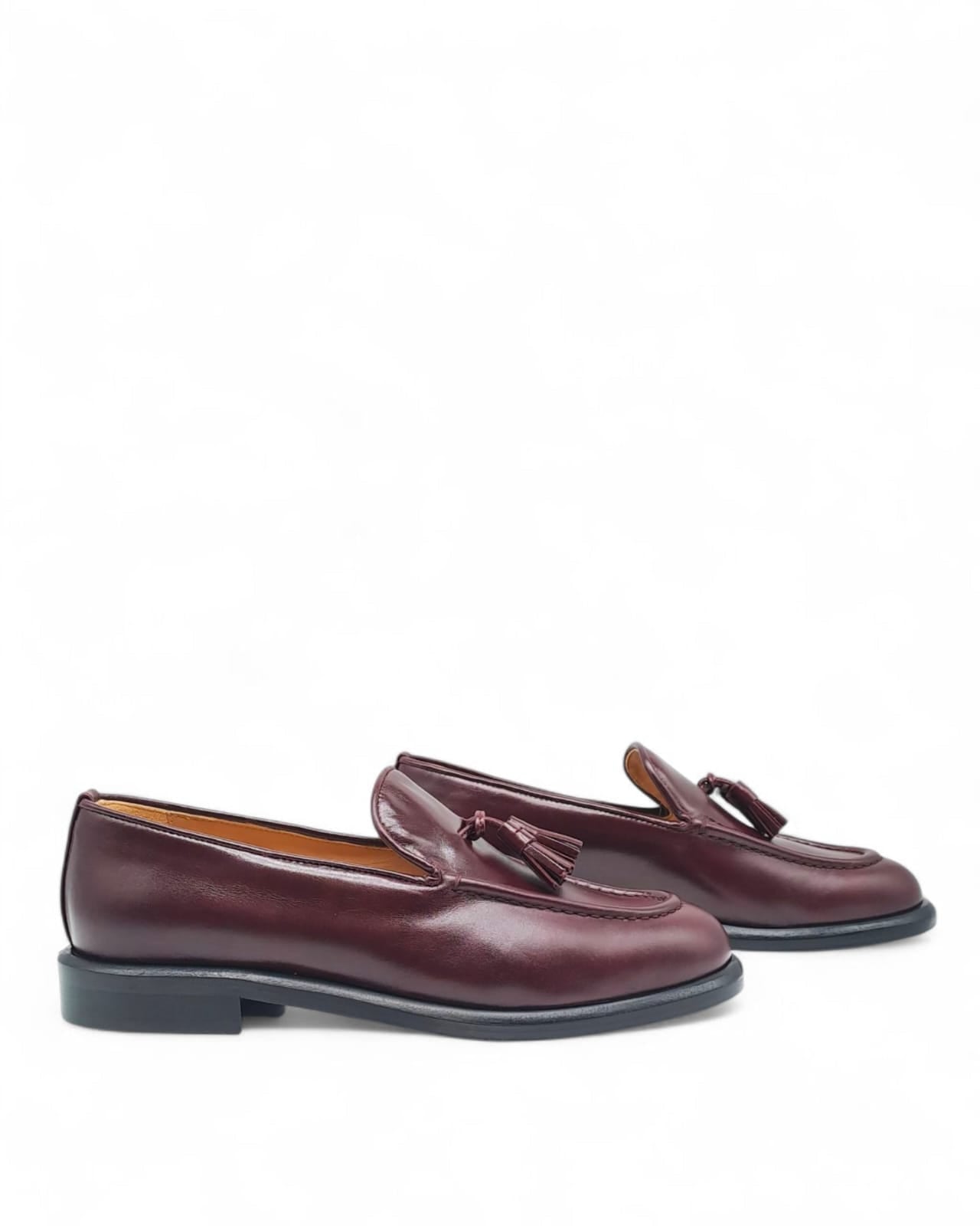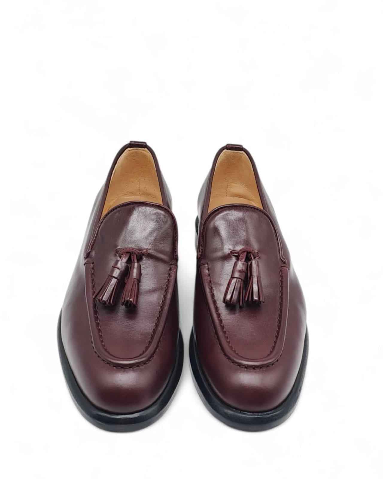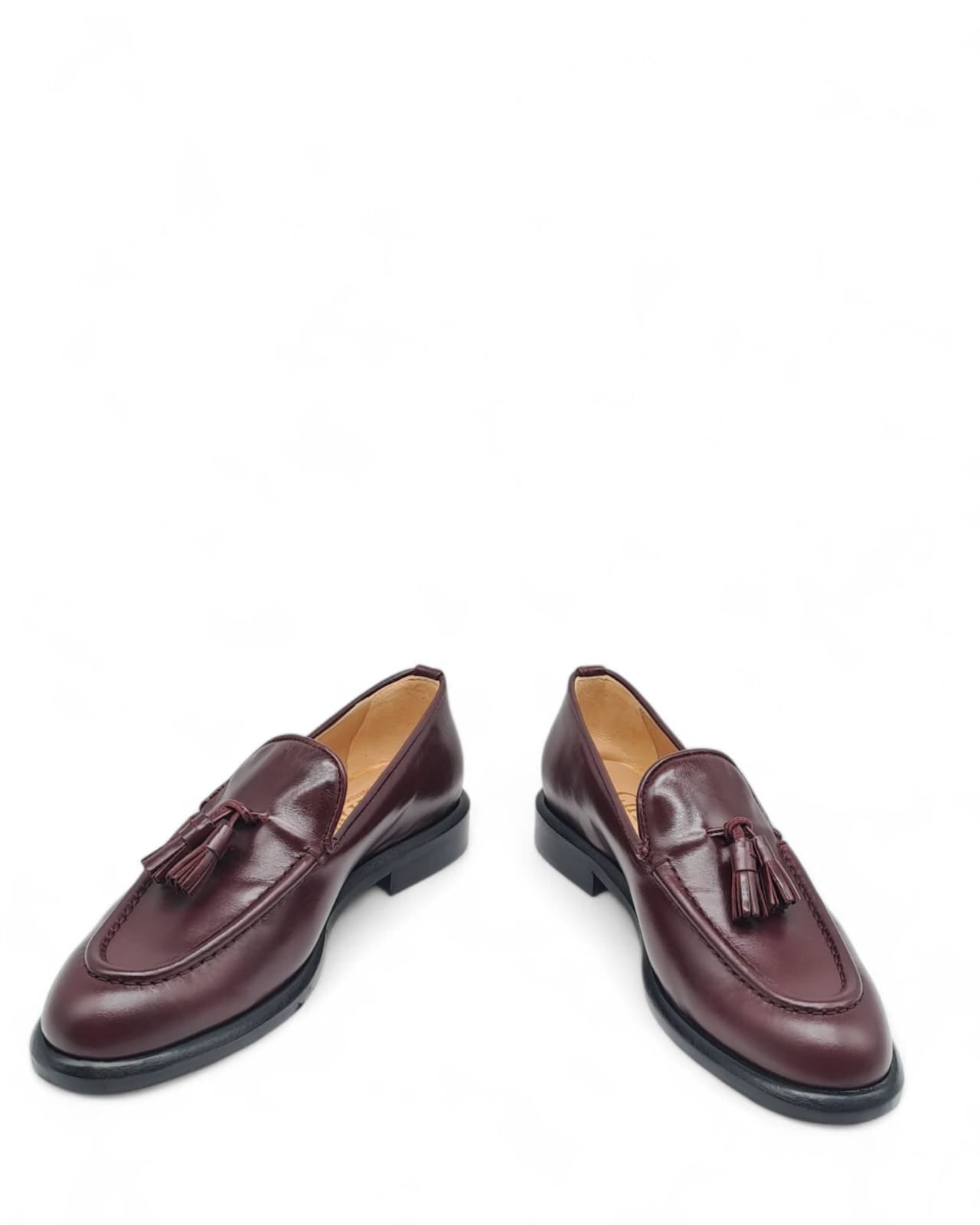 Mocassino con  nappine realizzato  in pelle  vino , lavorazione "a sacchetto":