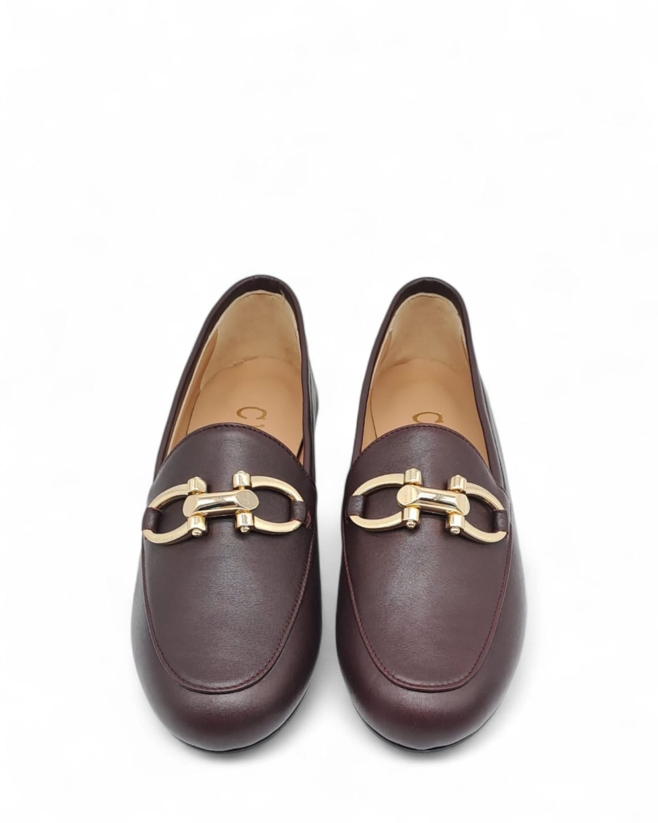 Mocassino realizzato  in pelle  vino con morsetto dorato .