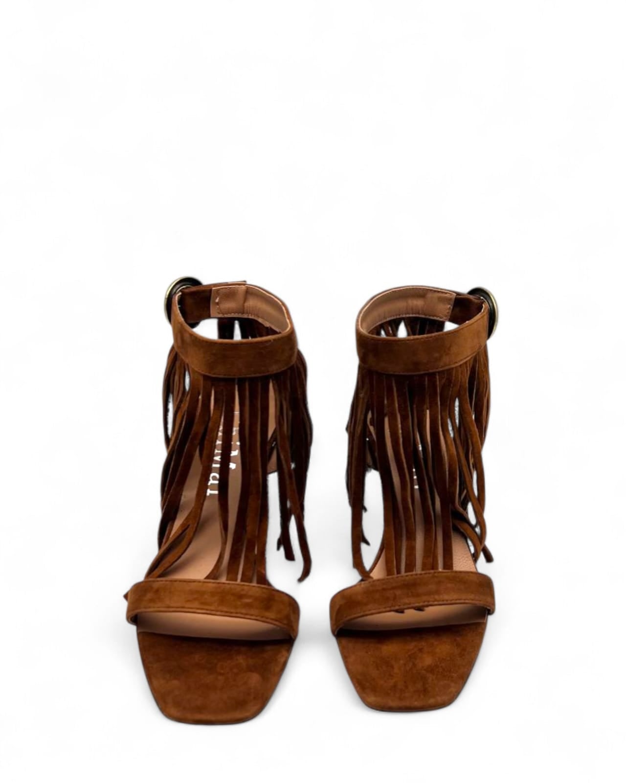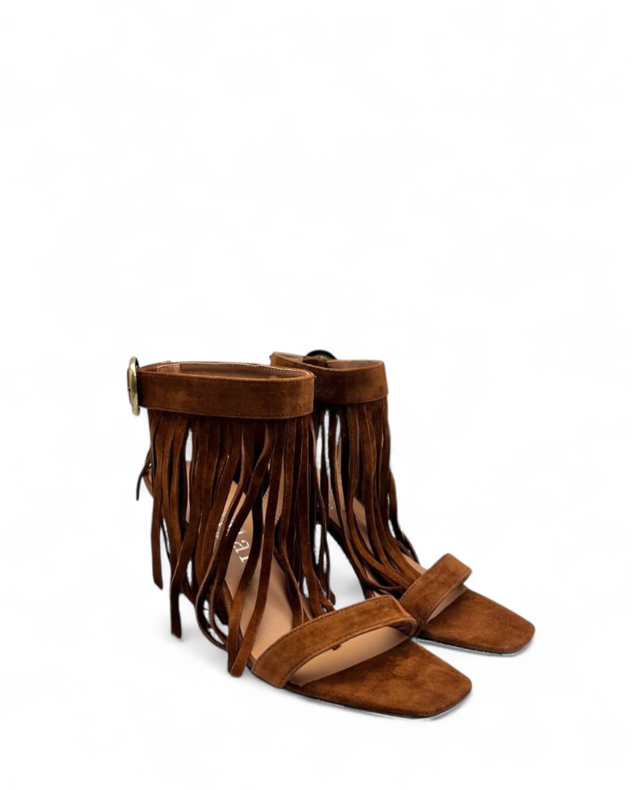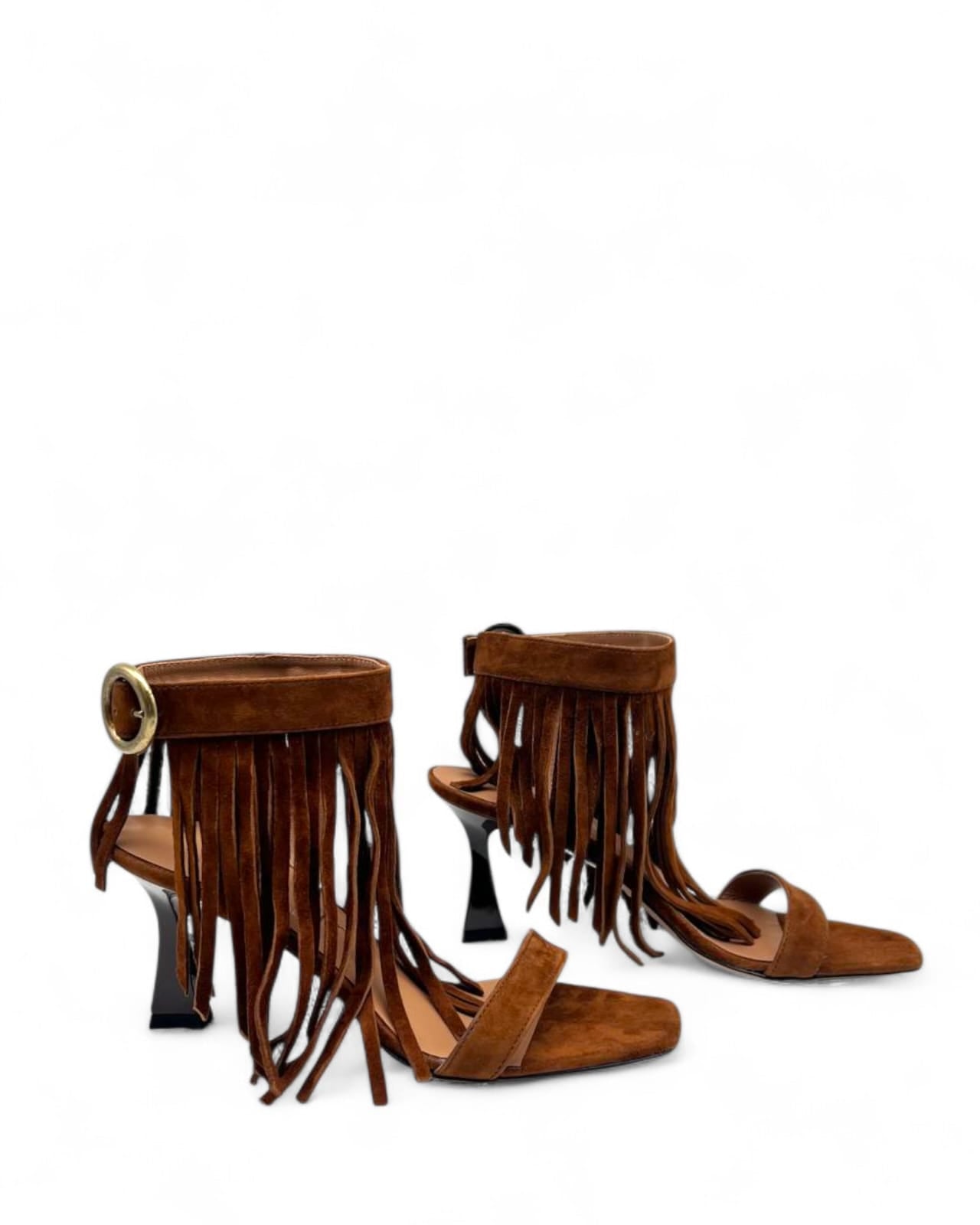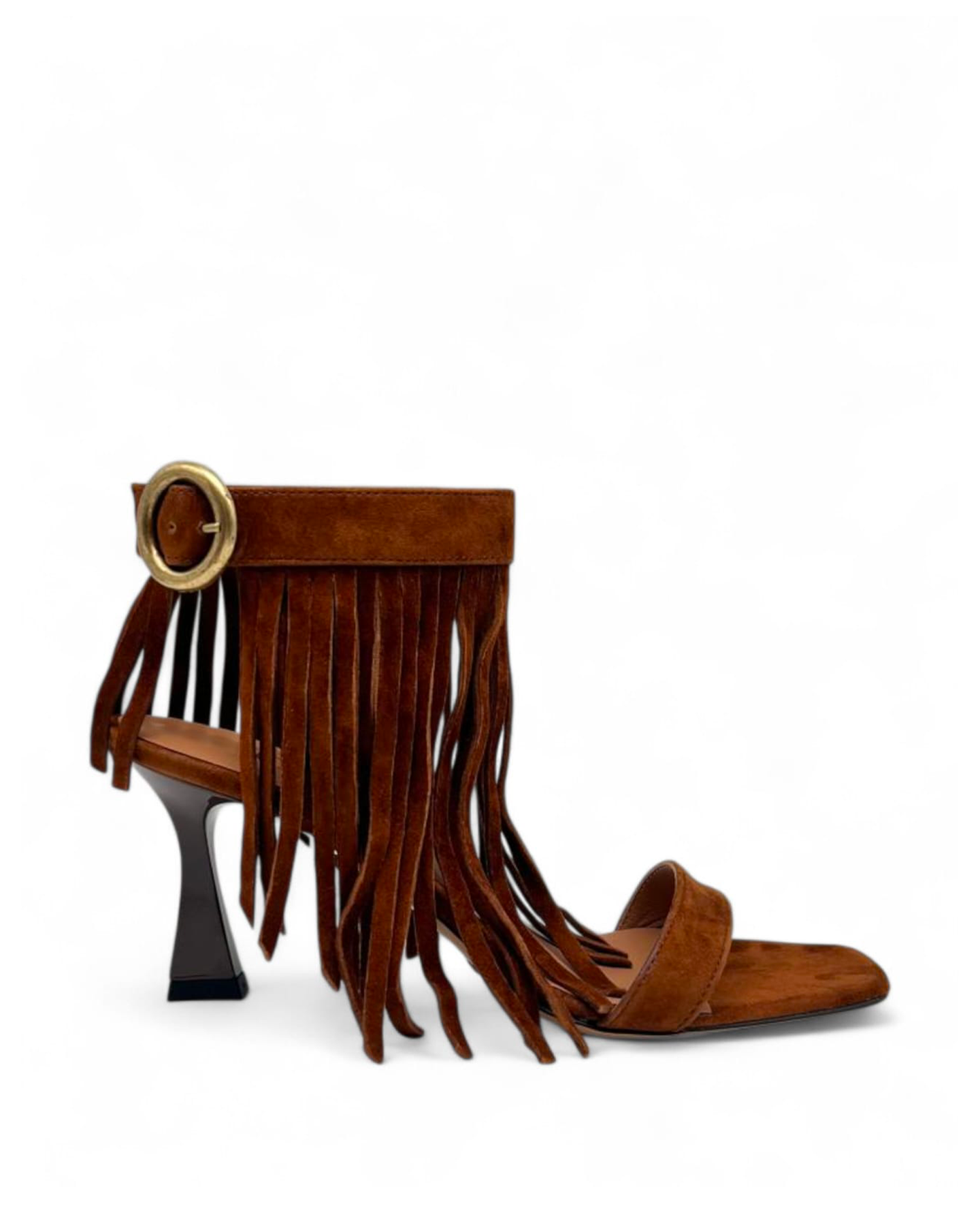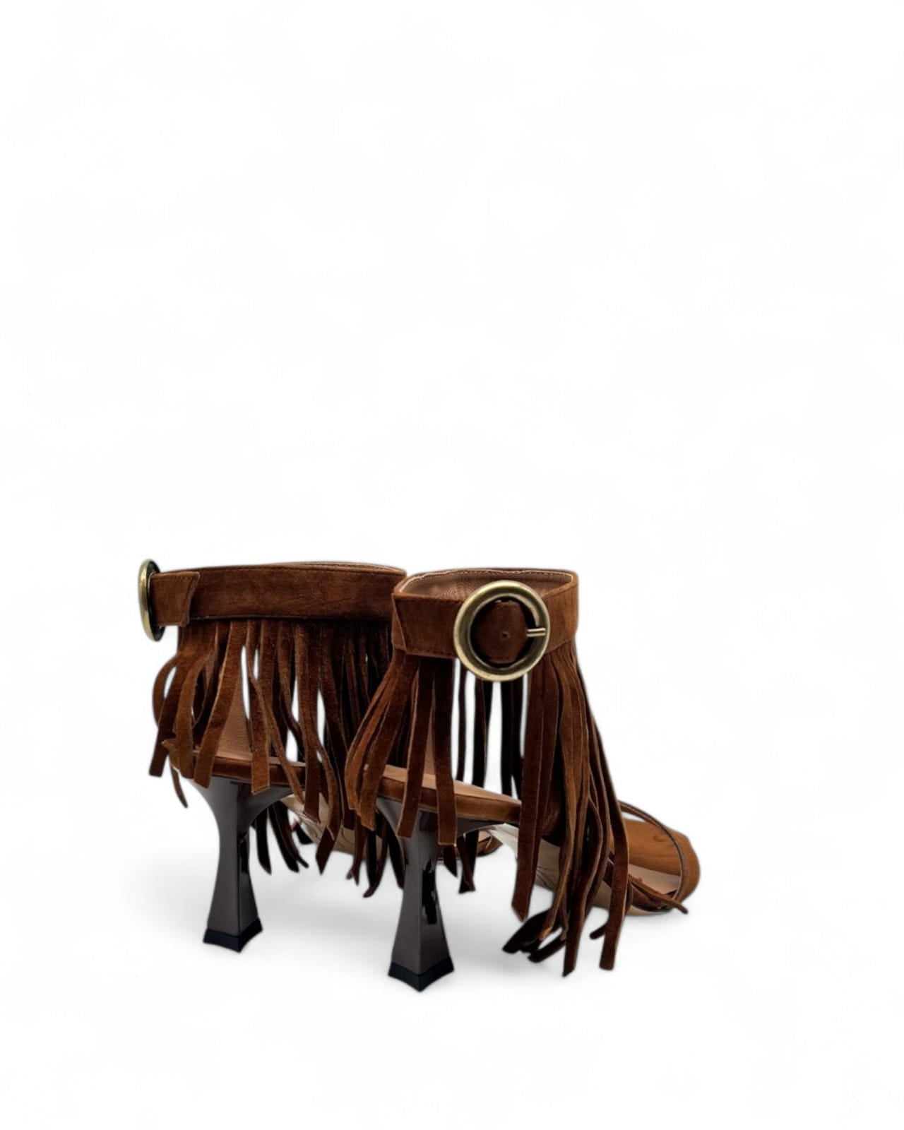 Sandalo realizzato in camoscio cuoio nera con fibbia regolabile dorata e frange in tinta .