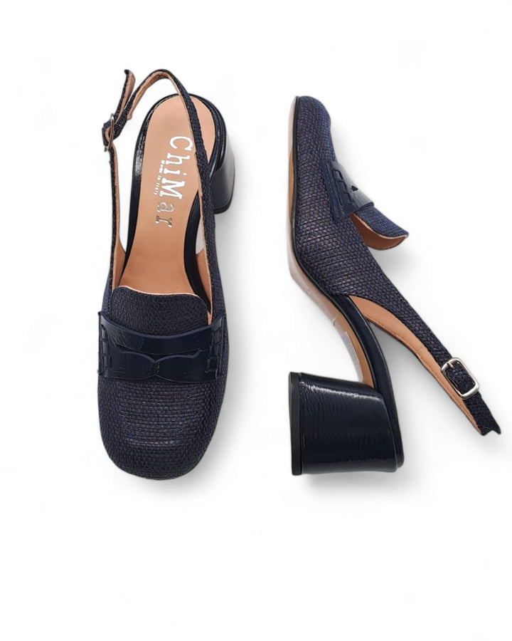 Slingback punta quadra realizzata in rafia blu con bendina e tacco vernice blu