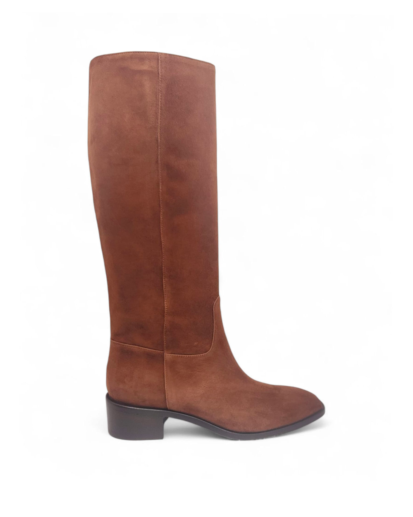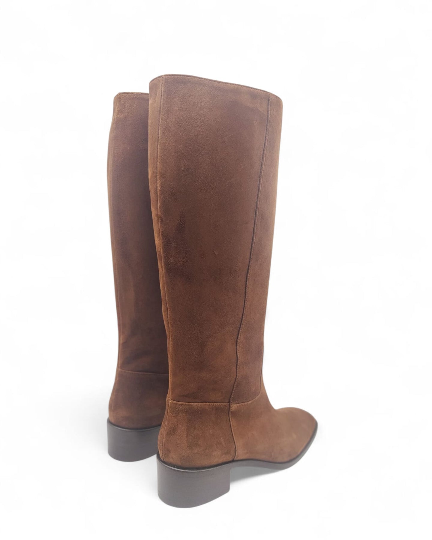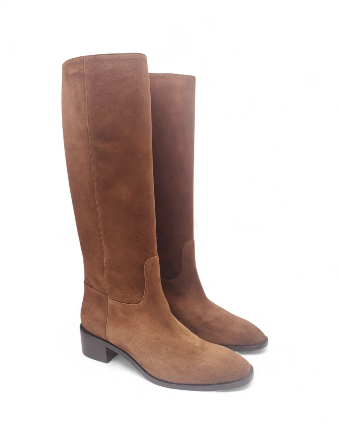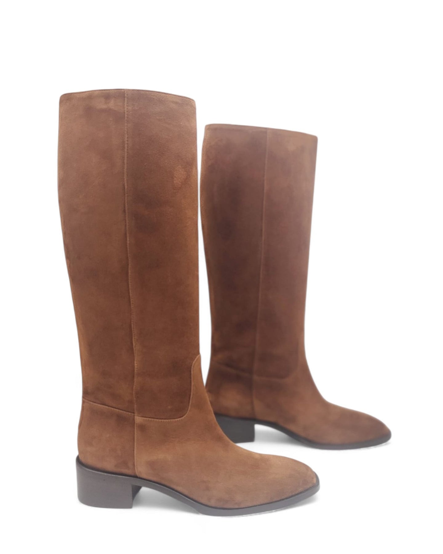 Stivali tubolari realizzati in camoscio sigaro, punta tonda. Contattaci