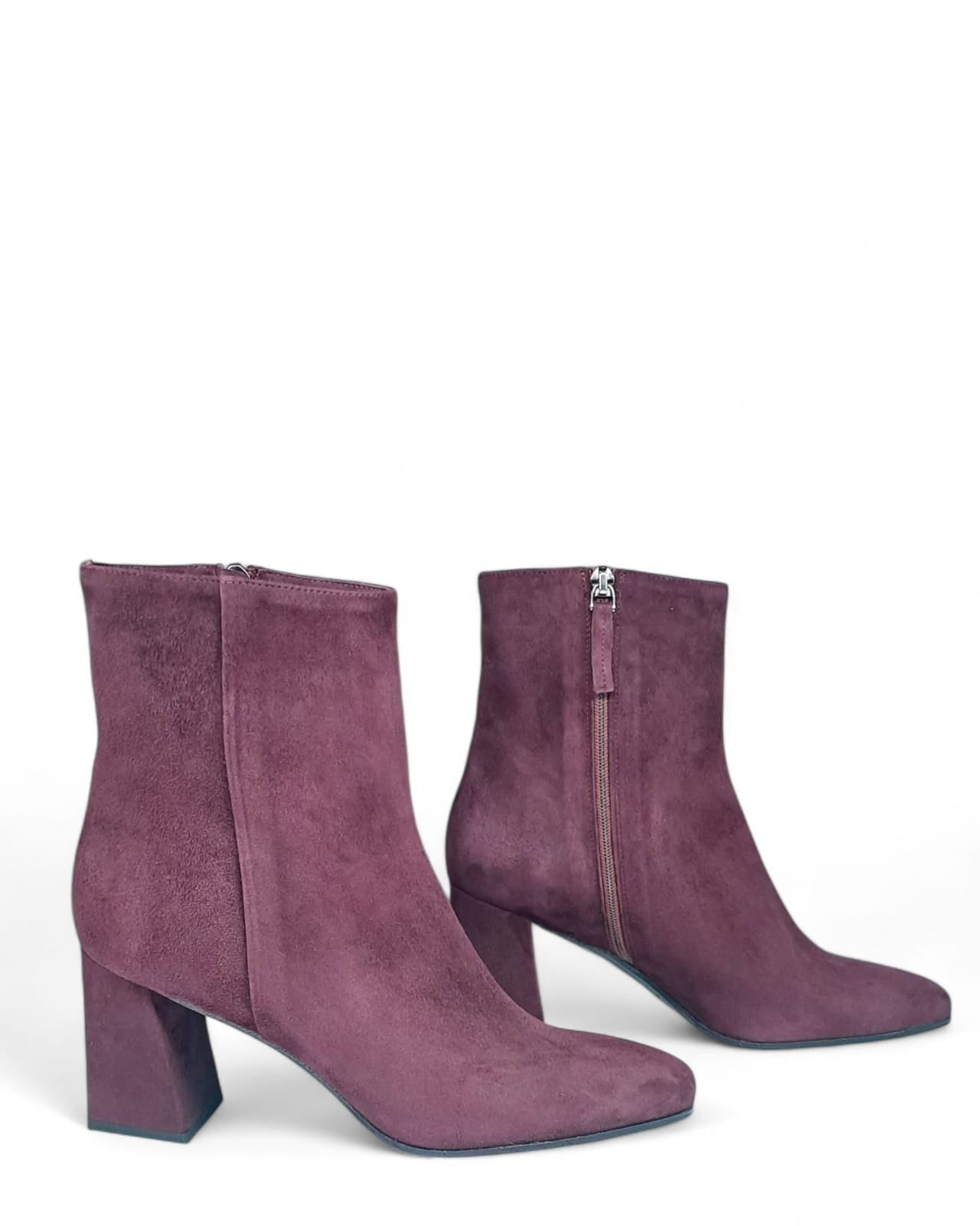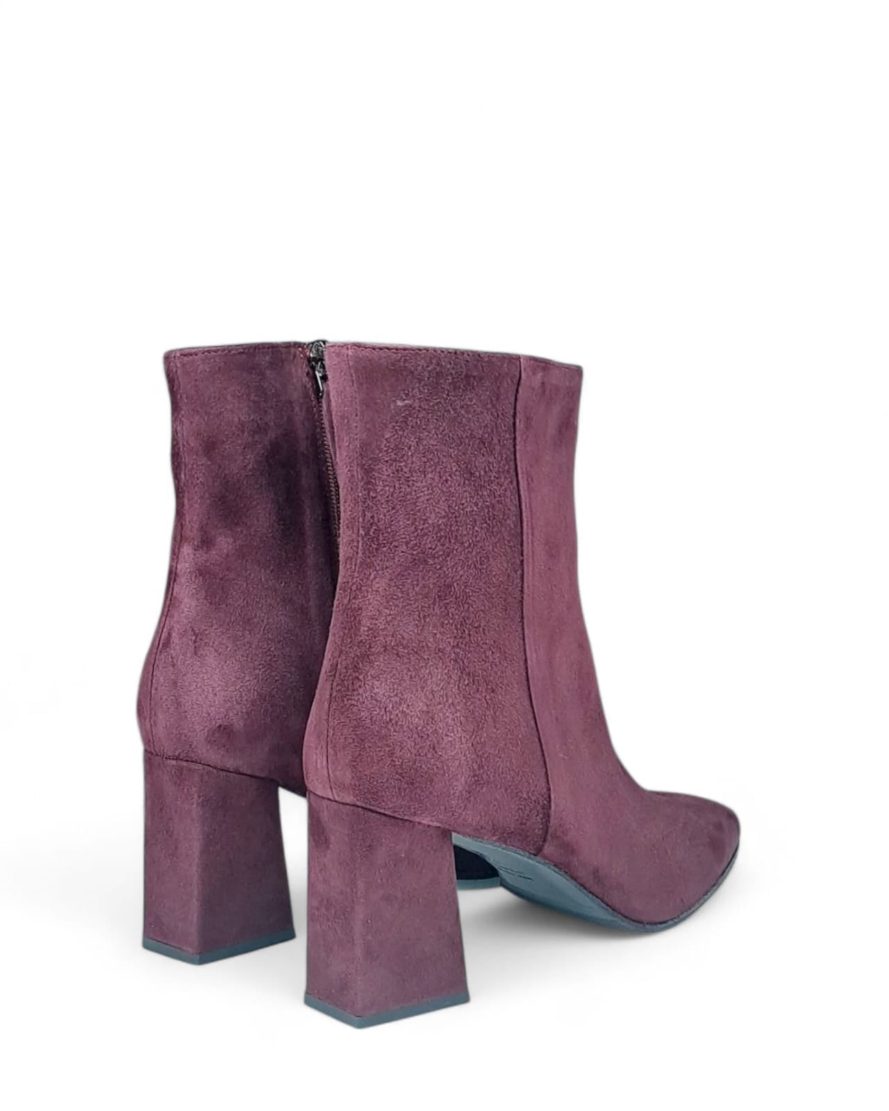 Tronchetto con tacco a blocco scolpito con punta squadrata , lavorazione a sacchetto , realizzato in camoscio vino , con suola in cuoio / mezza piantina in gomma.