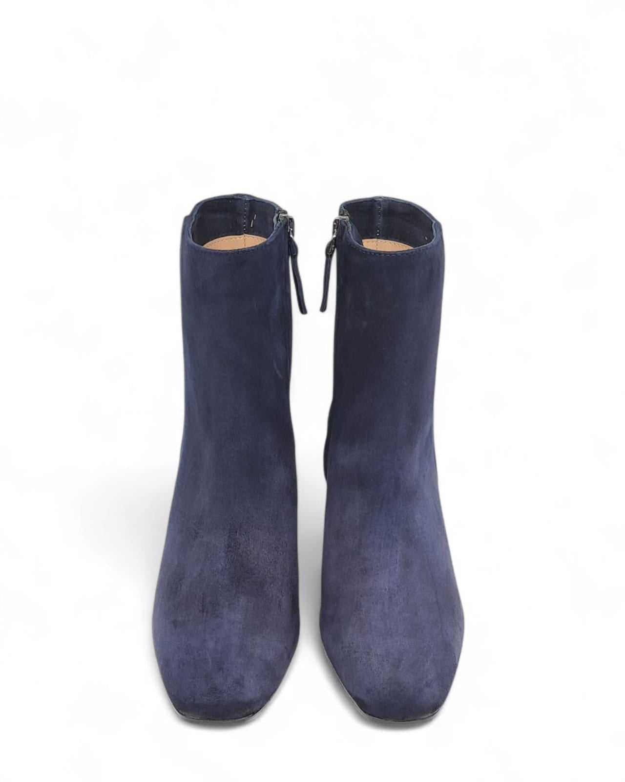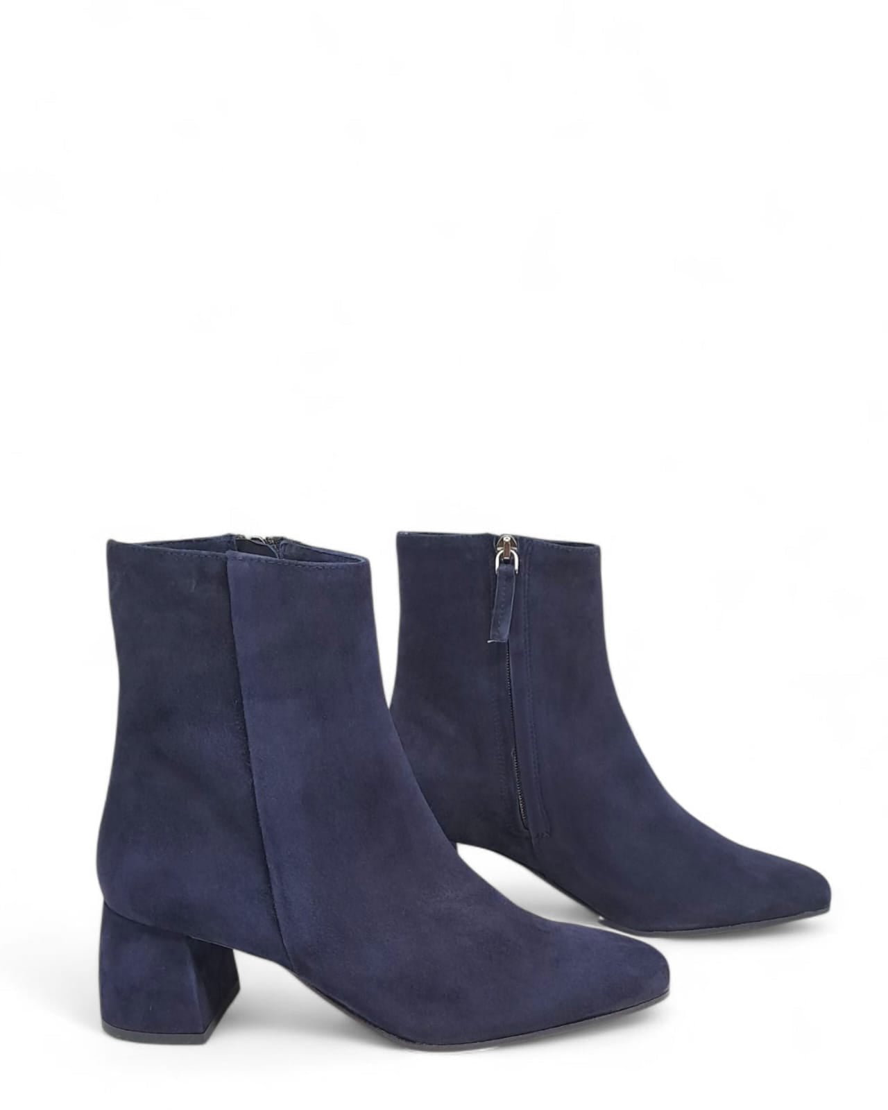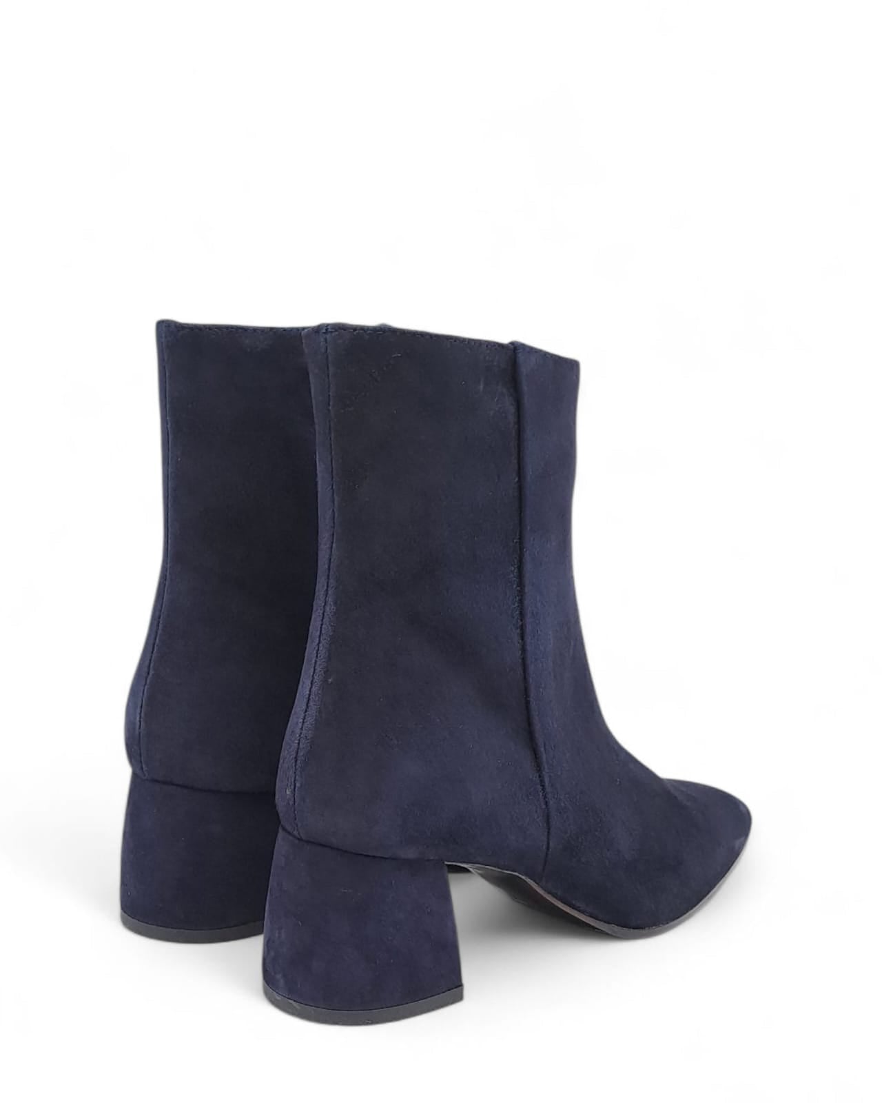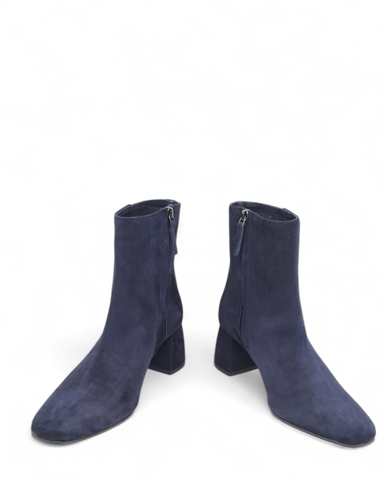 Tronchetto con punta squadrata , lavorazione a sacchetto , realizzato in camoscio blu , con suola in cuoio / mezza piantina in gomma.