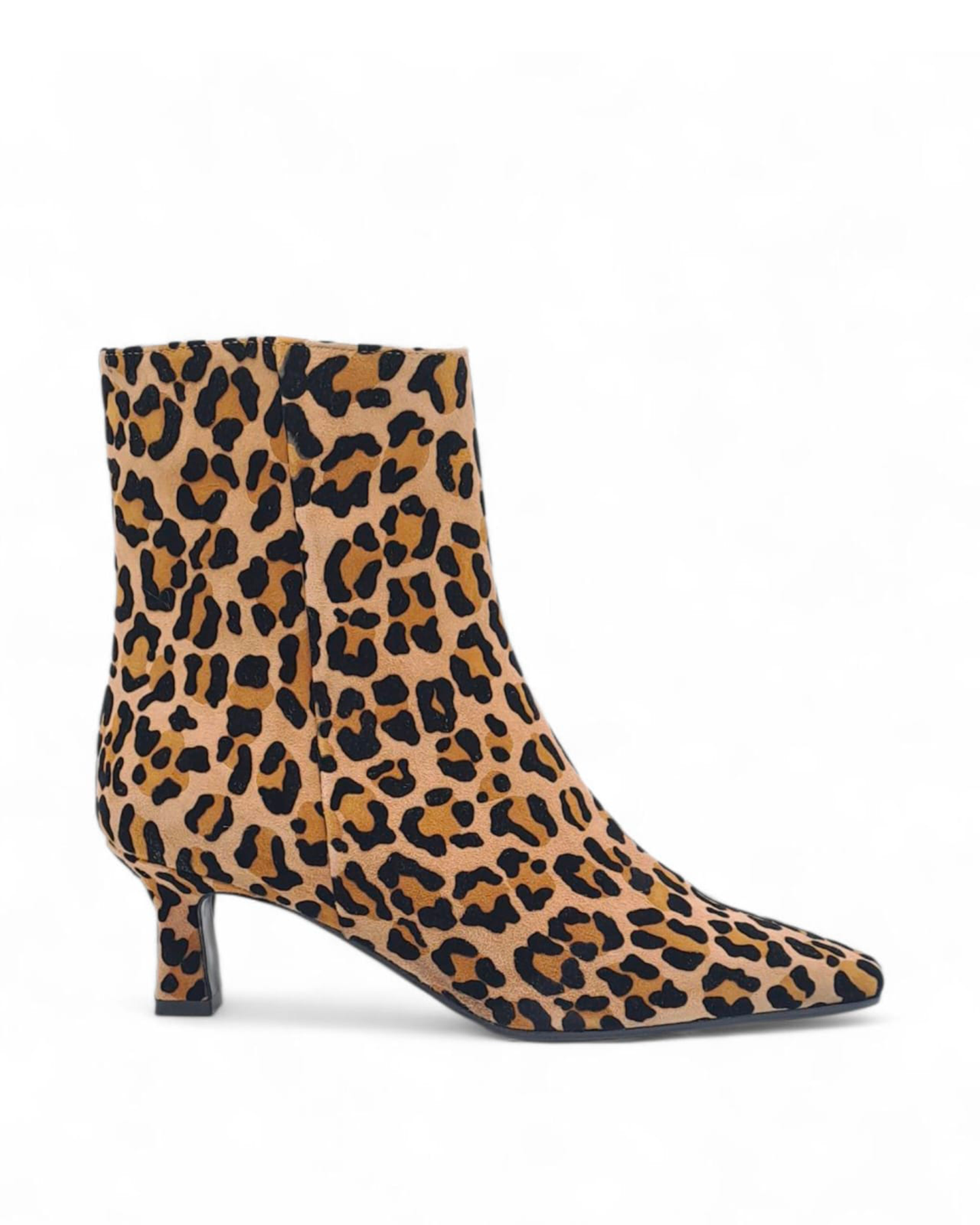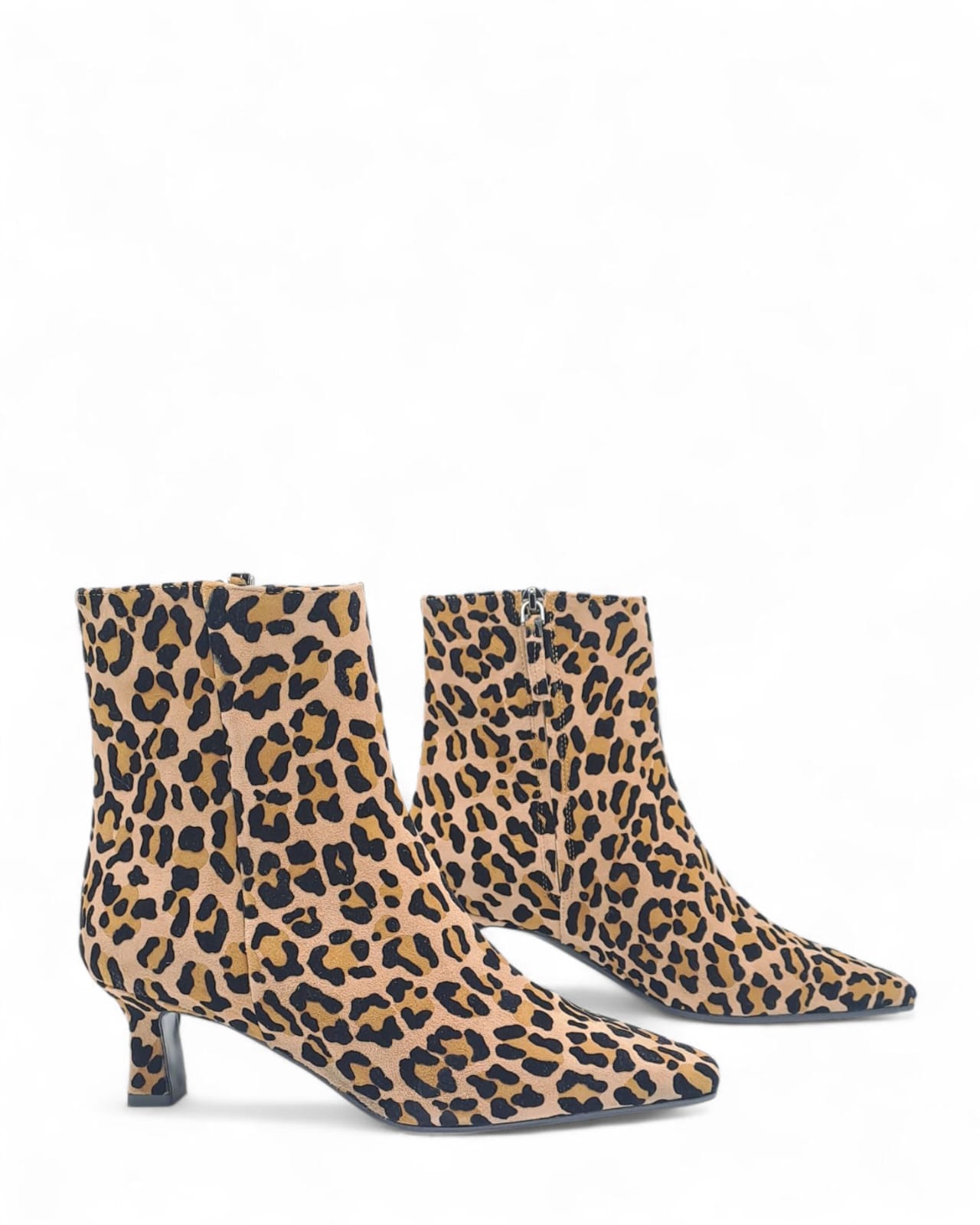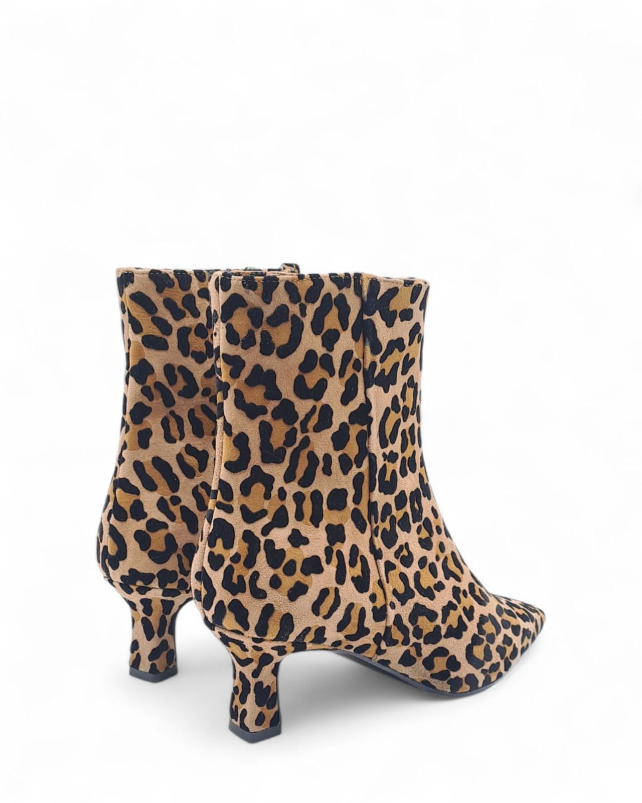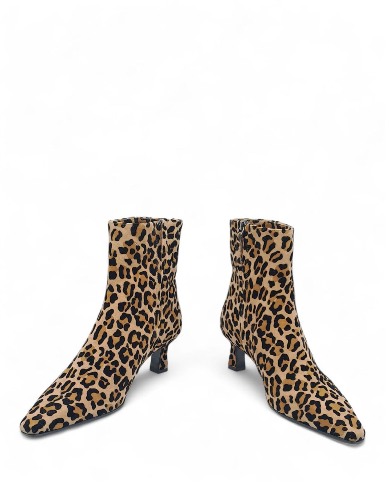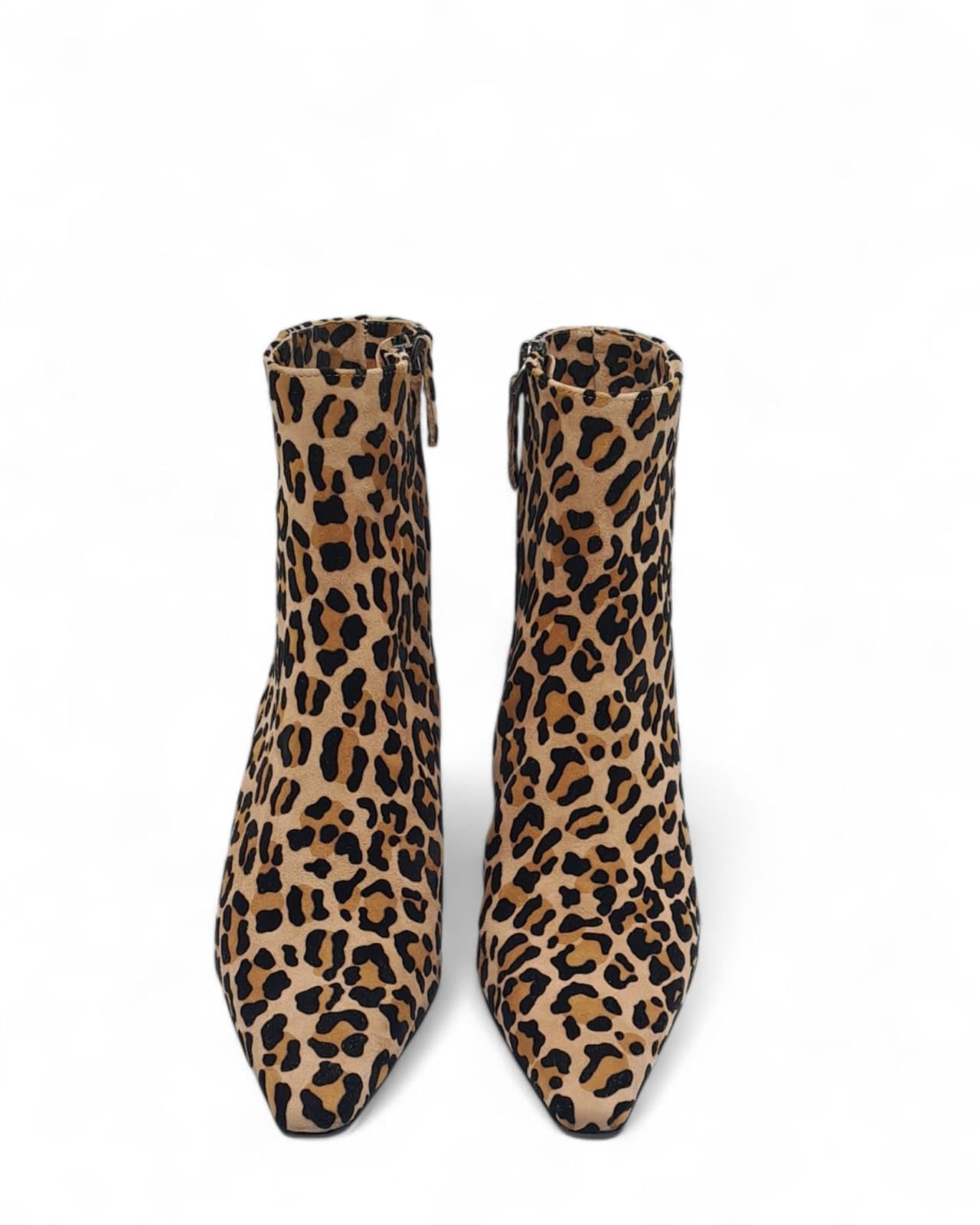 Tronchetto a punta , lavorazione a sacchetto , realizzato in camoscio floccato brandy , con suola in cuoio / mezza piantina in gomma.
