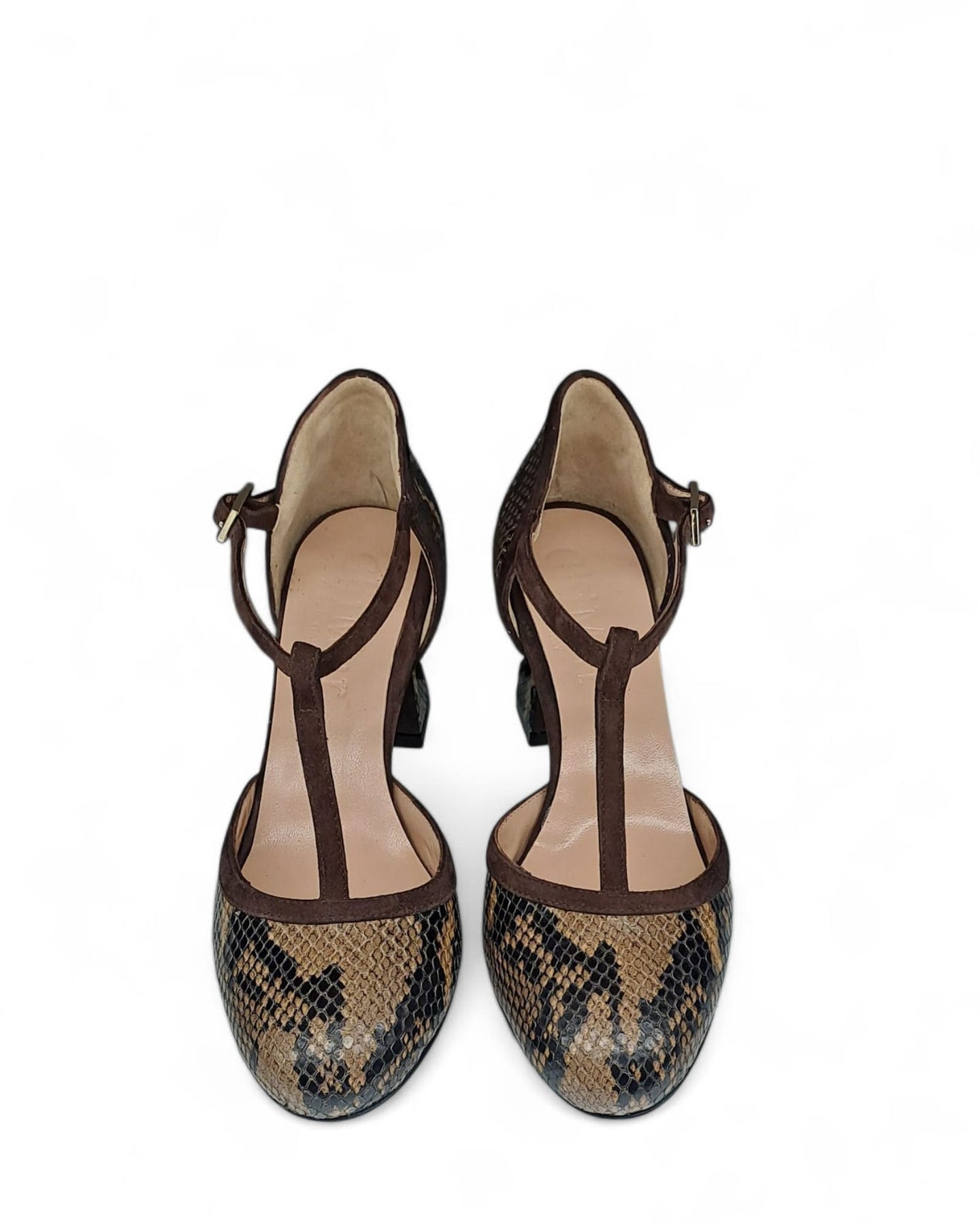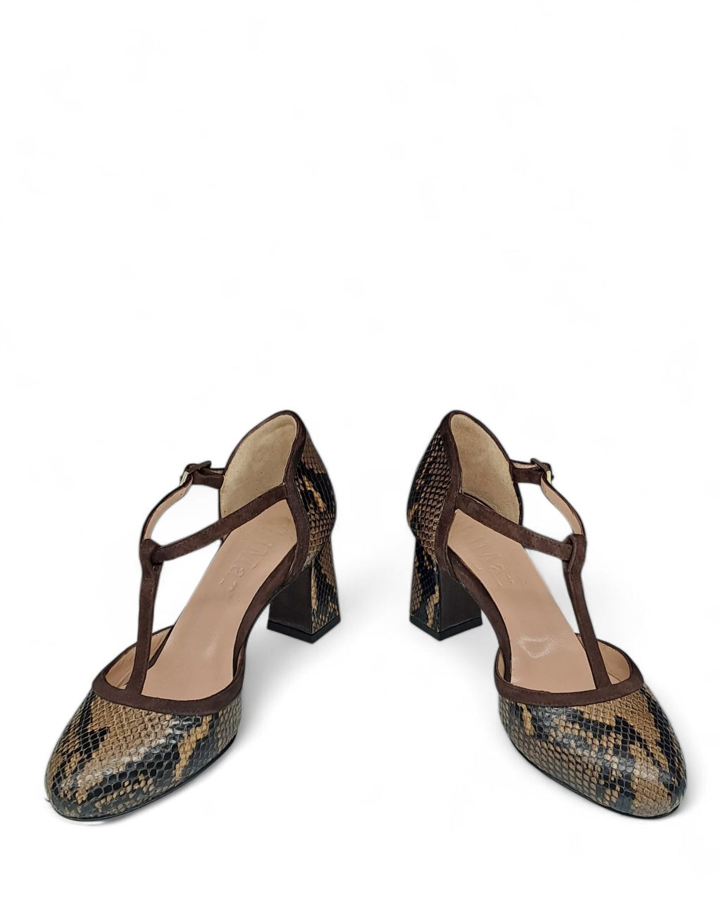 Tango décolleté made of raffia, details and t-bar in leather nappa, ankle strap and real leather sole.
