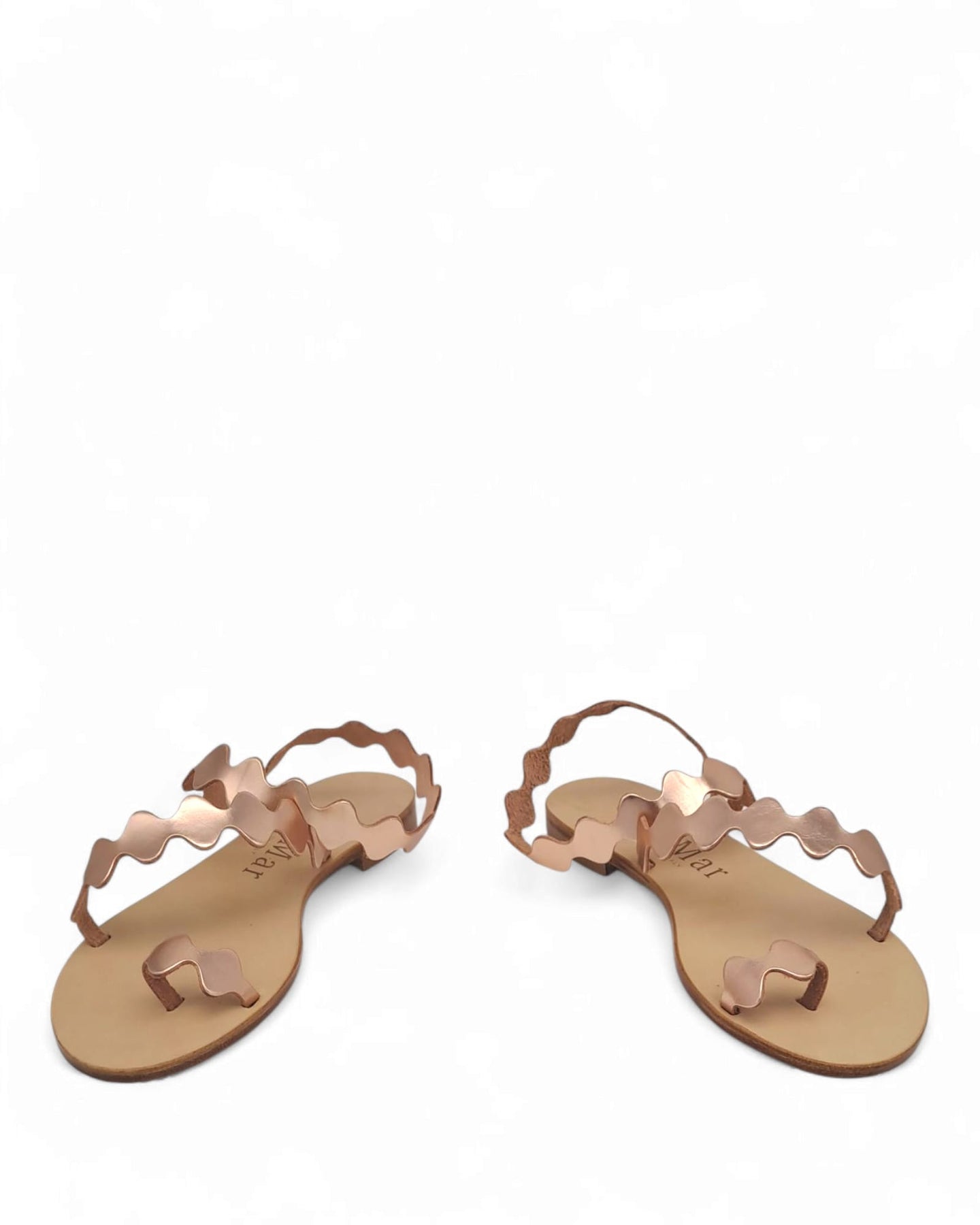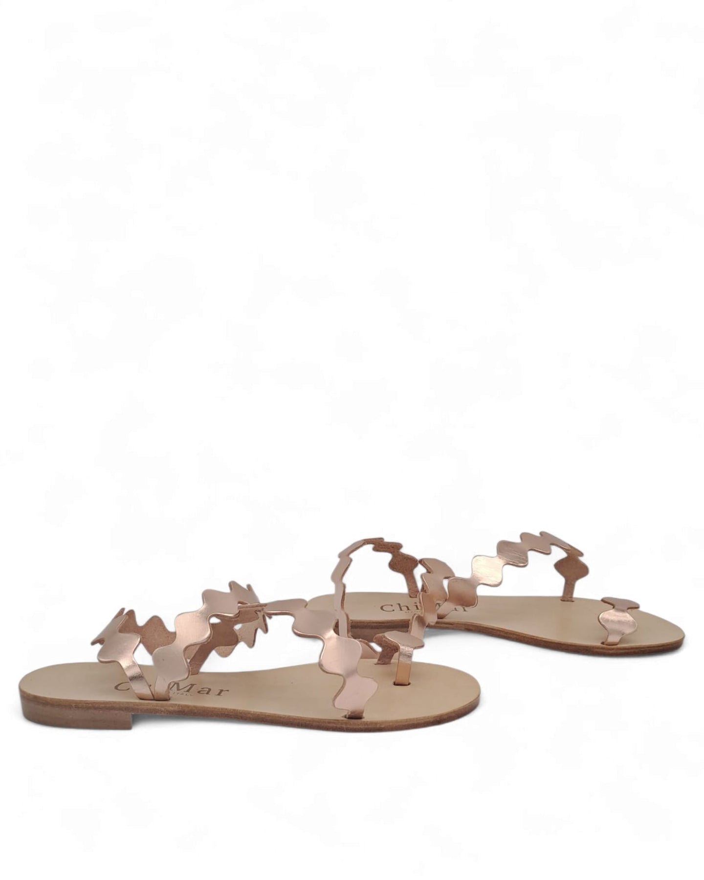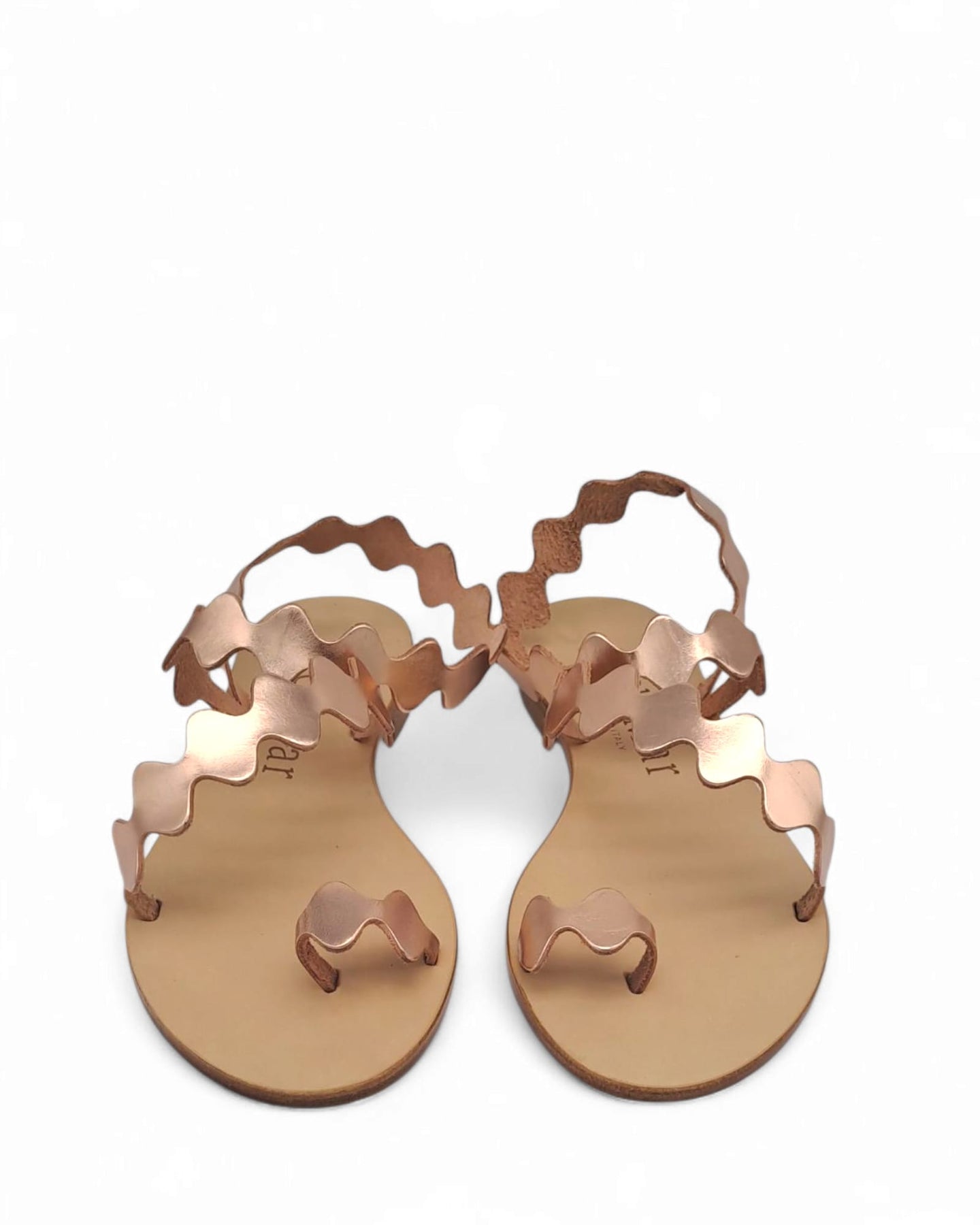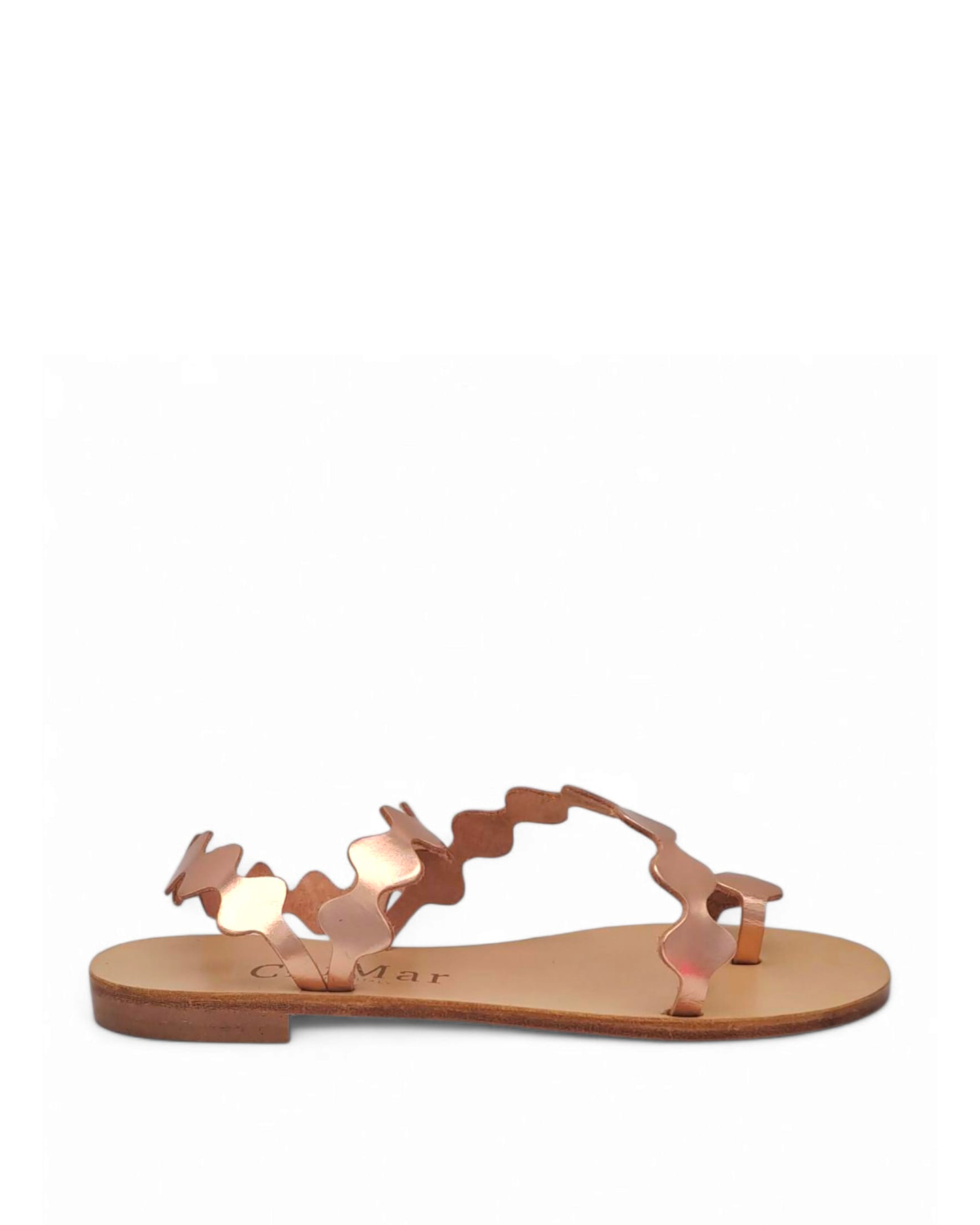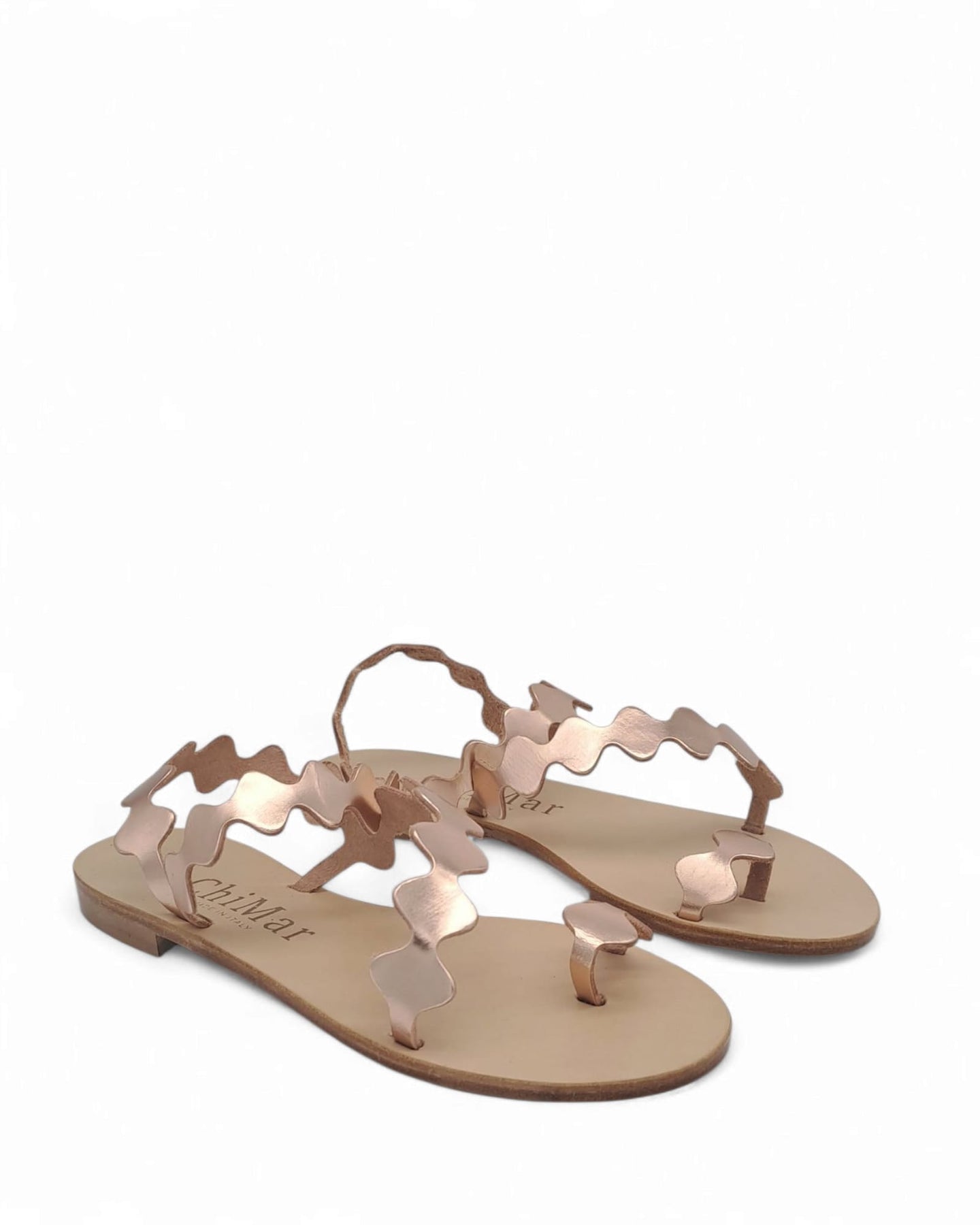 Sandalo Onda realizzato in pelle laminata rame con fasce ondulate . Contattaci