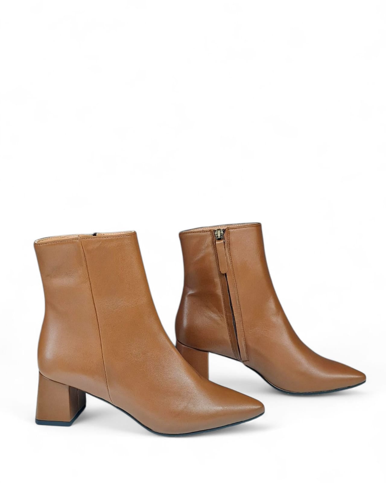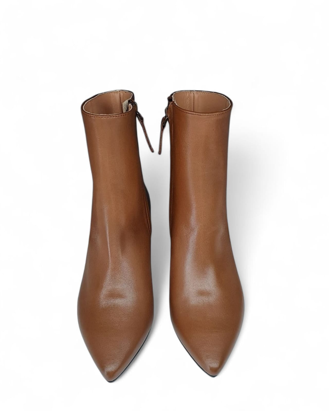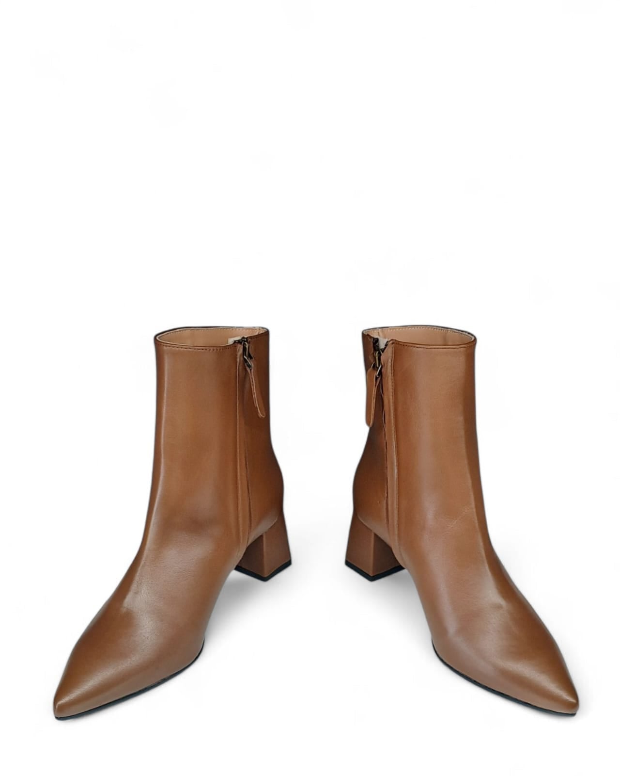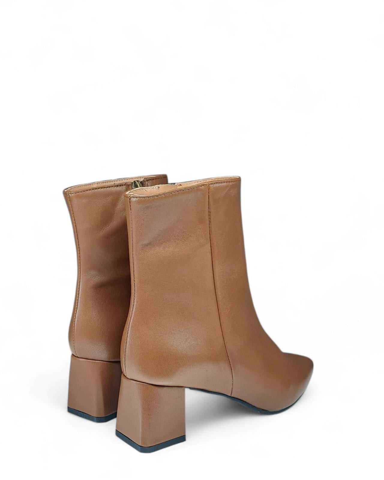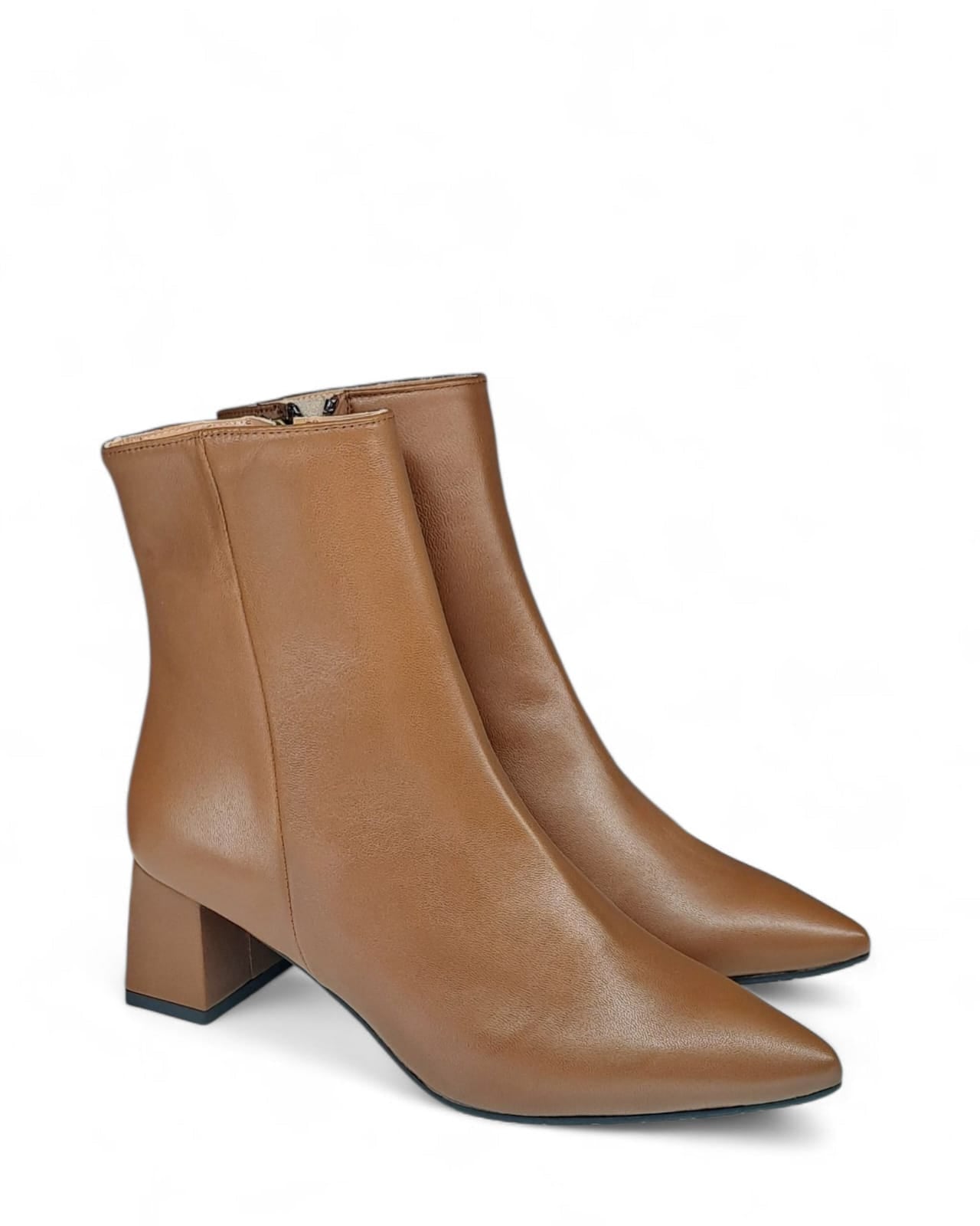 Tronchetto a punta in nappa cuoio con taglio laterale e impuntura a vista tinta su tinta. Chiusura tramite cerniera sul lato interno.